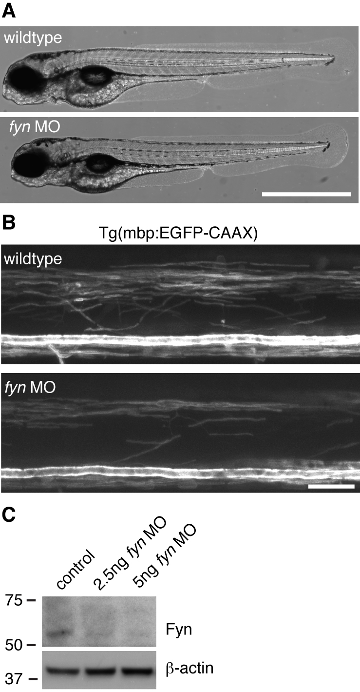 (B) Confocal images of Tg(mbp:EGFP-CAAX) expressing control (top) and fyn morphant (bottom) animals show that abrogation of Fyn function causes a reduction in myelination. Scale bar: 25μm.