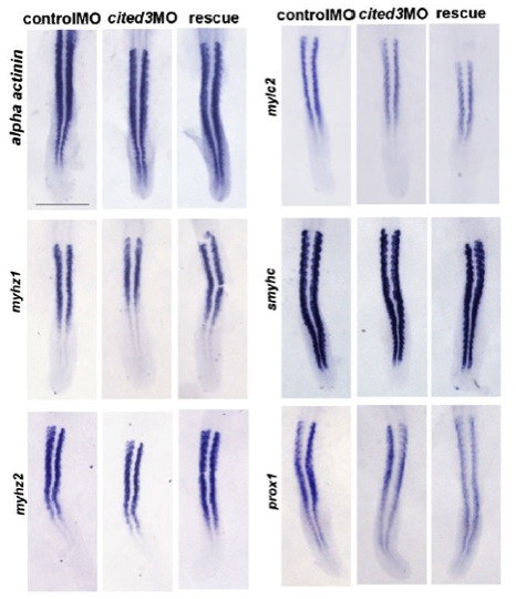 Fig. S6 In situ hybridization results for representative genes that are expressed in the somites at 19 hpf. Expression levels of alpha actinin, myhz1, myhz2, mylc2, smyhc and prox1 were not affected in cited3 morphants at 19 hpf.