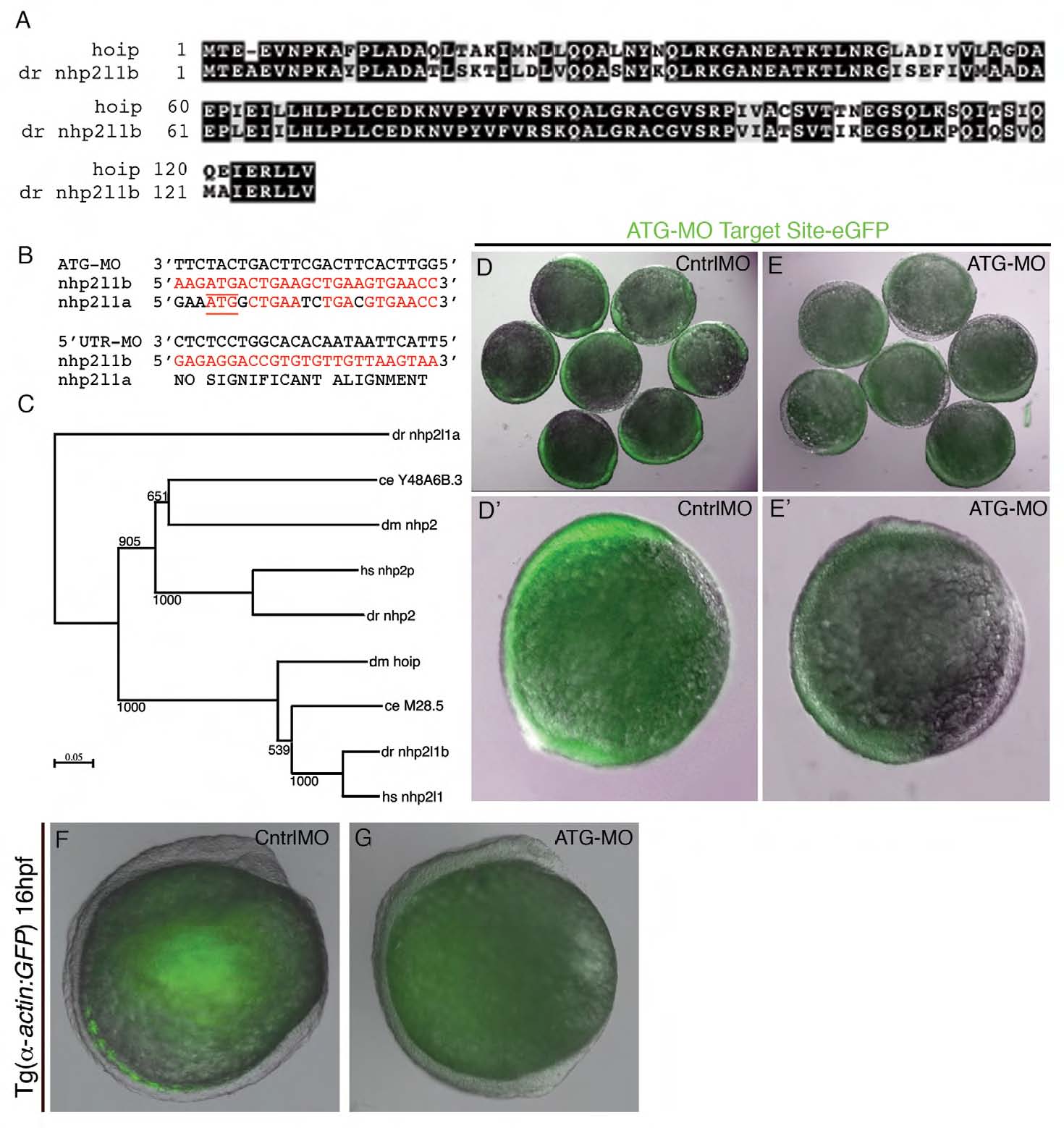 nhp2l1b is a Hoip orthologue and the nhp2l1b ATG-MO efficiently blocks translation. (A) Alignment between Hoip and zebrafish nhp2l1b protein sequences. Identical amino acids are shaded black; similar amino acids are shaded gray. (B) Alignment of the nhp2l1a/b translational start sequences with the ATG-MO and 5′UTR-MO. Target nucleotides are red. The beginning of the ORF is underlined. (C) Phylogenetic analysis of NHP2 and NHP2L1 proteins in worms (ce), flies (dm), zebrafish (dr) and humans (hs). Bootstrap values are given. (D) Zebrafish embryos co-injected with Control-MO and an eGFP construct containing the nhp2l1b target site in the 52UTR show robust eGFP expression at 12 hpf. (E) Embryos co-injected with ATG-MO and the same eGFP construct as in D show a significant reduction in eGFP expression. (F,G) Tg(α-actin:GFP) embryos injected with ATG-MO did not develop beyond 16 hpf.