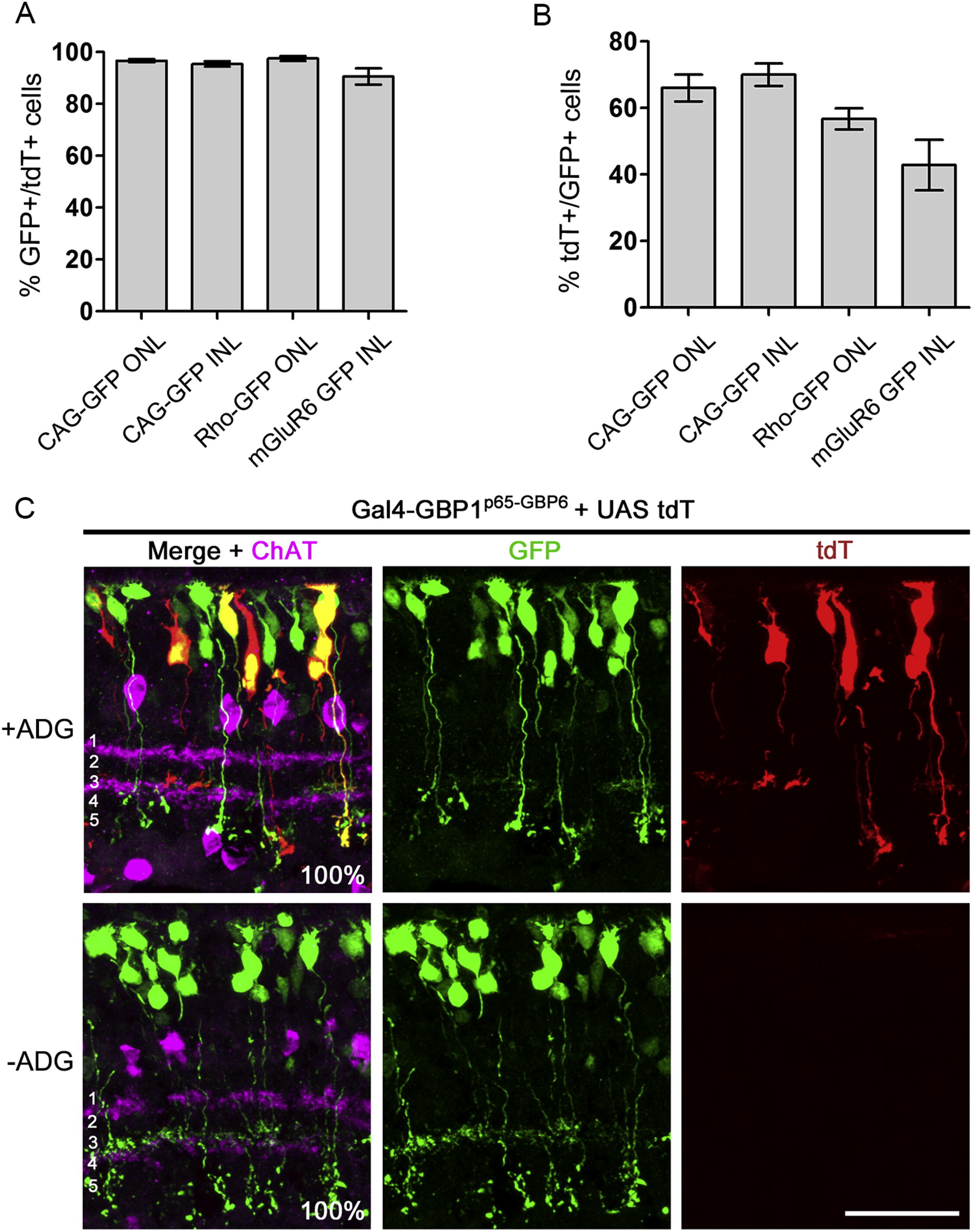 (C) mGluR6-GFP bipolar cells project to the correct IPL sublaminae in the presence of Gal4-GBP1p65-GBP6. CD1 mouse retinas were electroporated at P0 with plasmids encoding mGluR6-GFP (green), Gal4-GBP1p65-GBP6, UAS-tdT (red) and CAG-nlacZ. Retinas stained for anti-GFP (green) and anti-ChAT (magenta). The IPL is divided into 5 sublaminae (white font in merge panels), with the ON bipolar cells stratifying below the midline dividing sublaminae 2 and 3. Anti-ChAT labels the boundary between sublaminae 1 and 2, and also the boundary between 3 and 4. % GFP+ and GFP+/tdT+ cells stratifying below the midline of 2 and 3 are shown in merge panels. n = 28 for +ADG condition and n = 31 for –ADG condition. Cells were sampled across two retinas per condition. Scale bar, 20 μm.