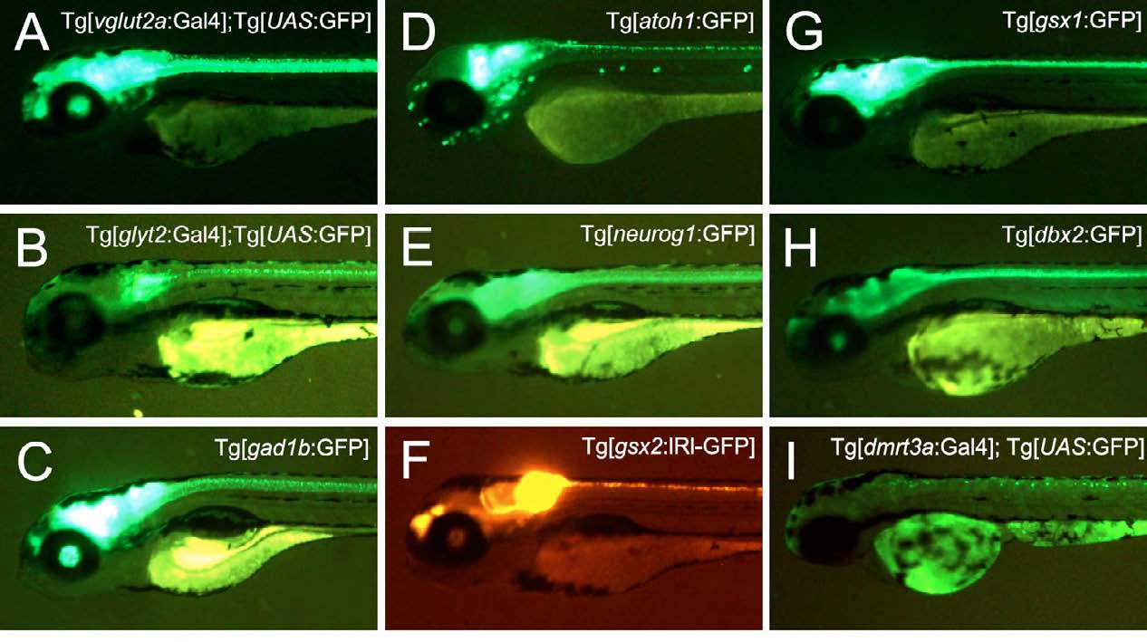 Fluorescent images of the entire body in the newly generated transgenic fish. (A-I) Images were taken from fish that were 3.5 dpf.
