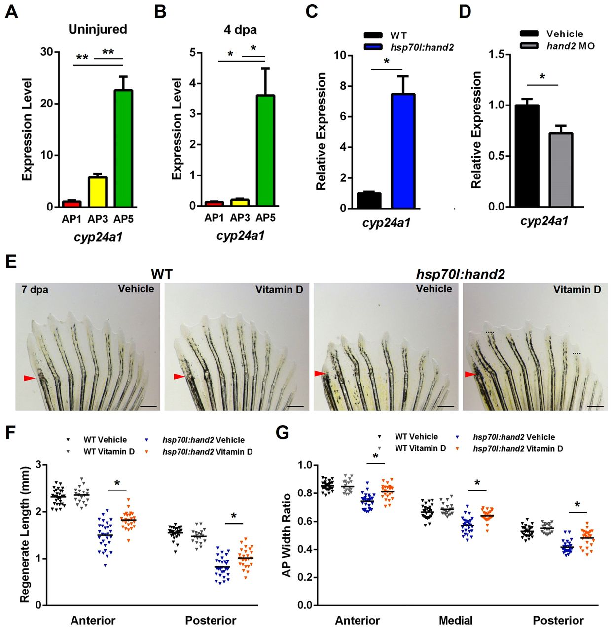 AP regionalization of vitamin D signaling controlled by Hand2. (A) cyp24a1, which encodes a vitamin D-inactivating enzyme, is more highly expressed in posterior regions of uninjured pectoral fins. (B) Posterior enrichment of cyp24a1 is maintained during regeneration at 4 dpa. (C) hand2 induction daily during regeneration elevates anterior cyp24a1 expression <7.5-fold at 4 dpa relative to heat-shocked wild-type clutchmate controls. (D) hand2 morpholino injection into pectoral fin regenerates reduces posterior cyp24a1 expression by <28% relative to vehicle-injected clutchmate controls. (A-D) Expression is normalized to actb1. *P<0.05, **P<0.005, Student’s t-test. n=3; mean ± s.e.m. (E) Appearance of 7-dpa fins from hsp70l:hand2 and wild-type clutchmates given a daily heat shock and either daily vehicle or vitamin D injections. Vitamin D injection had little effect on wild-type regeneration, but partially suppressed the effects on bone patterning caused by hand2 overexpression. Representative regenerative growth of hsp70l:hand2 vehicle-injected rays 3 and 8 is denoted by dotted lines. Arrowheads indicate amputation plane. (F) Quantification of the effects of daily vitamin D injection on ray lengths, indicating improvement in hsp70l:hand2 animals. (G) Daily vitamin D injection increases ray widths in regenerating hsp70l:hand2 fins. (F,G) n=20-28; bar indicates mean. **P<0.05, Student’s t-test. Scale bars: 0.6 mm.
