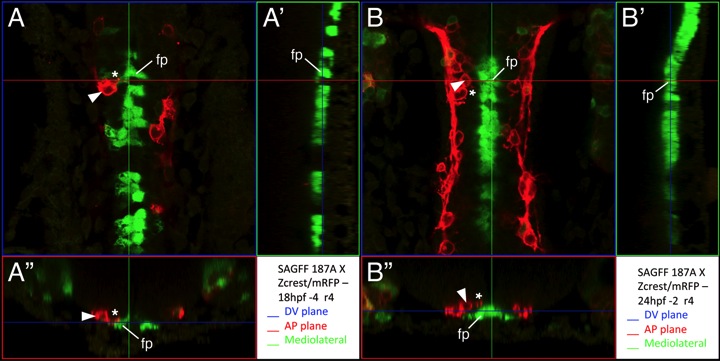 Confocal projection views of the hindbrain of SAGFF187A aka Tg(Fp:Gal4FF); Tg(UAS:GFP); Tg(zCREST:mRFP) embryos stained with anti-RFP antibody to label FBM neurons (red) and anti- GFP antibody to label UAS:GFP-expressing cells (green). (A, B) Dorsal views at the levels indicated by blue lines in A′′ and B′′. Protrusions (asterisks) from FBM neurons (arrowheads) are very close to or in contact with floor plate cells (fp). (A′,B′) Sagittal views (mediolateral projections) at the levels indicated by green lines in A and B. (A′′,B′′) Cross-sectional views at the anterior-posterior levels indicated by red lines in A and B. The protrusions from FBM neurons are touching or in apposition to the floor plate cells. We restricted our analysis to FBM neurons located in r4/r5, and found that 34/52 protrusions (44 neurons in 8 embryos) contacted floor plate cells.