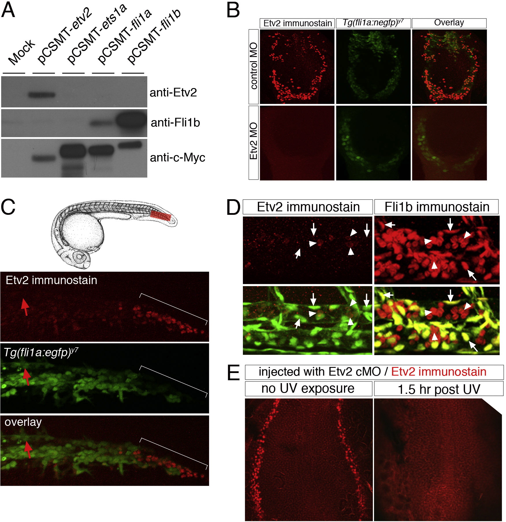 Fig. S1 Etv2 protein expression. (A) SDS–PAGE gel of HEK293T lysates transfected with CMV-driven expression vectors encoding myc-tagged zebrafish Etv2, Ets1a, Fli1a, Fli1b, or left untransfected (mock). Lysates from each sample were run on triplicate immunoblots, which were individually probed with Etv2 or Fli1b polyclonal antiserum, or a monoclonal against the myc-epitope (9E10). The Etv2 polyclonal serum recognizes a single band that is the same size as that recognized following immunodetection for the myc epitope. (B) Tg(fli1a:negfp)y7 embryos at 18 hpf injected with 5 ng of control or Etv2 MO followed by immunostaining using Etv2 polyclonal serum and Alexa-568 secondary. Etv2 antibody staining is clearly visible in embryos injected with control MO, but absent in embryos injected with 5 ng of an Etv2 translation blocking morpholino. (C) Top, camera lucida drawings of embryo at approximately 24 hpf. Bottom, immunostaining of an Tg(fli1a:egfp)y1 embryo with Etv2 polyclonal serum and alexa-568 secondary at 24 hpf. Faint Etv2 expression can be observed in many EGFP-positive cells within the caudal vein plexus, while strong Etv2 expression is apparent in a separate EGFP-negative population of cells (indicated by a white bracket). Etv2 expression is not detectable in the caudal aorta at this time point (red arrows). (D) Two photon micrographs of Tg(fli1a:negfp)y7 embryos immunostained with Etv2 (left panels) or Fli1b (right panels) polyclonal serum. Top panels are signal from Alexa-568 secondary antibody. Bottom panels are overlay of Alexa-568 and EGFP fluorescence. Images are higher magnification views of embryos shown in Fig. 1 G and I. Left, arrows indicate EGFP-positive endothelial nuclei that do not express Etv2; arrowheads indicate EGFP-negative/Etv2-positive cells within the dorsal aorta. Right, arrows indicate EGFP-positive endothelial nuclei that also express Fli1b; arrowheads denote EGFP-negative/Fli1b-positive blood cells circulating within the dorsal aorta. (E) Flat mounted embryos at 5 ss immunostained with Etv2 polyclonal serum. Embryos were injected with Etv2 cMO and left in the dark (no UV exposure) or illuminated at approximately 2 ss with UV and allowed to develop for 1.5 h (1.5 h post UV) prior to fixation and immunostaining.