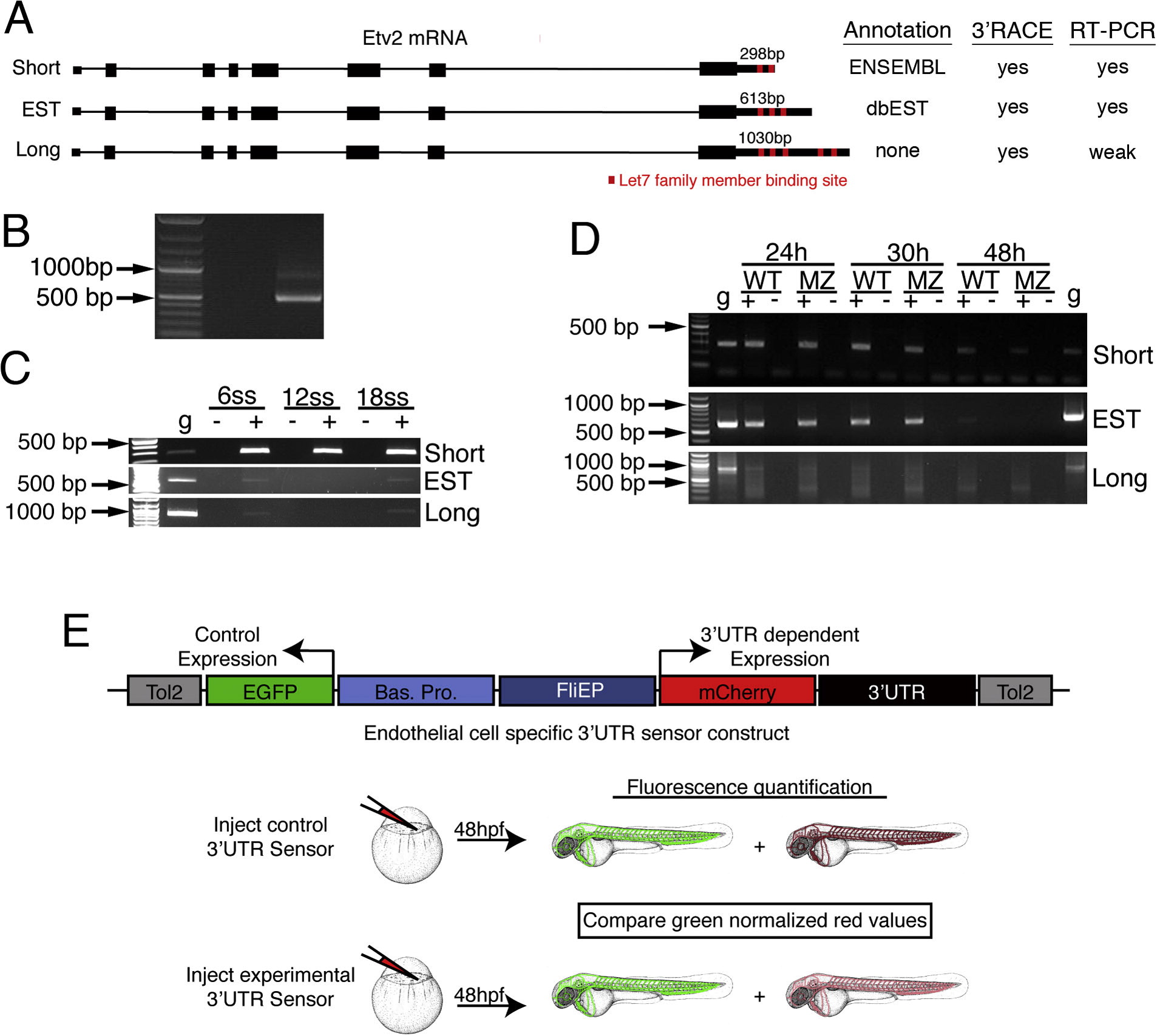 Fig. S2 Evidence for alternative 3′ UTRs encoded by the zebrafish etv2 locus. (A) Schematic depicting etv2 intron/exon structure and alternative 3′UTR lengths. Evidence for the existence of each isoform derived from annotation, 3′RACE, and RT-PCR is indicated. (B) 3′ RACE products amplified from 24 hpf embryos. (C, D) RT-PCR of etv2 UTRs from (C) wild type embryos at 6 to 18 ss and (D) wild type or MZDicer embryos at 24, 30, or 48 hpf. Genomic DNA (g) was used as a positive control. +denotes reverse transcribed cDNA template; indicates template without reverse transcription to rule out genomic DNA contamination. (E) Diagram of endothelial cell autonomous 3′ UTR sensor construct and experimental procedure for measuring post-transcriptional regulation of 3′ UTRs.