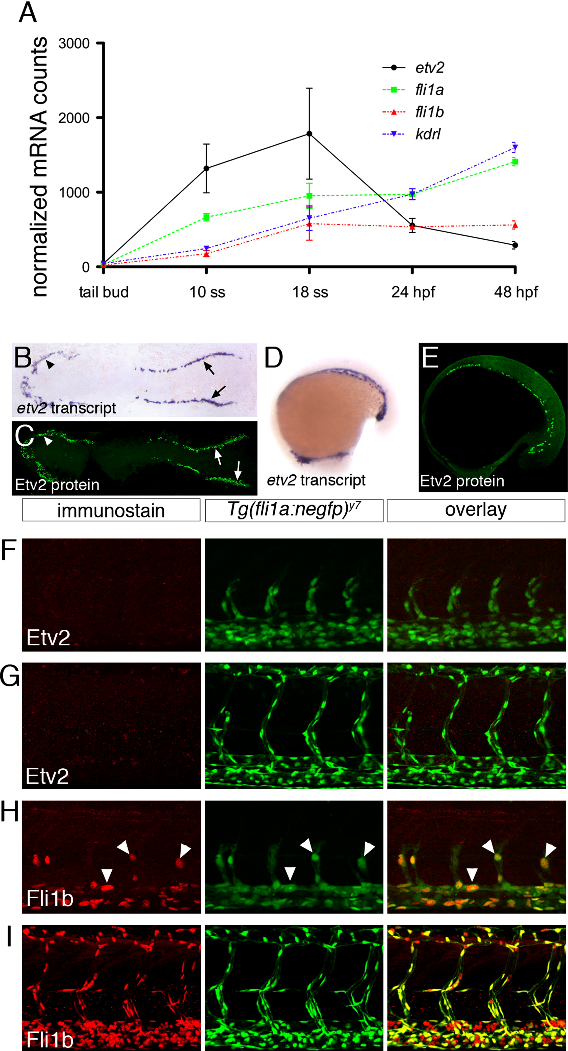 Fig. 1 Etv2 is down-regulated during vascular development. (A) Graph of nCounter quantification for etv2, fli1a, fli1b, and kdrl at the indicated developmental stages. Values are normalized to actb2 (beta-actin) and eef1a1l1(ef1alpha). (B, D) Whole mount in situ hybridization using an antisense etv2 riboprobe at 5ss and 18ss. (C, E) Embryos at 5 ss and 18 ss immunostained with Etv2 antibody and anti-rabbit Alexa-488. (B, C) Dorsal views of flat-mounted embryos, anterior to the left. (D, E) Lateral views, anterior to the left. (F–I) Two-photon micrographs of trunk vessels in fixed Tg(fli1a:negfp)y7 embryos immunostained with antibodies against (F, G) Etv2 or (H, I) Fli1b. Left panels, immunostained protein detected with Alexa-568 secondary antibody. Middle panels, transgenic expression of nuclear localized EGFP. Right panels, overlay of Alexa-568 and EGFP signals. Embryos at (F, H) 25 hpf or (G, I) 48 hpf.
