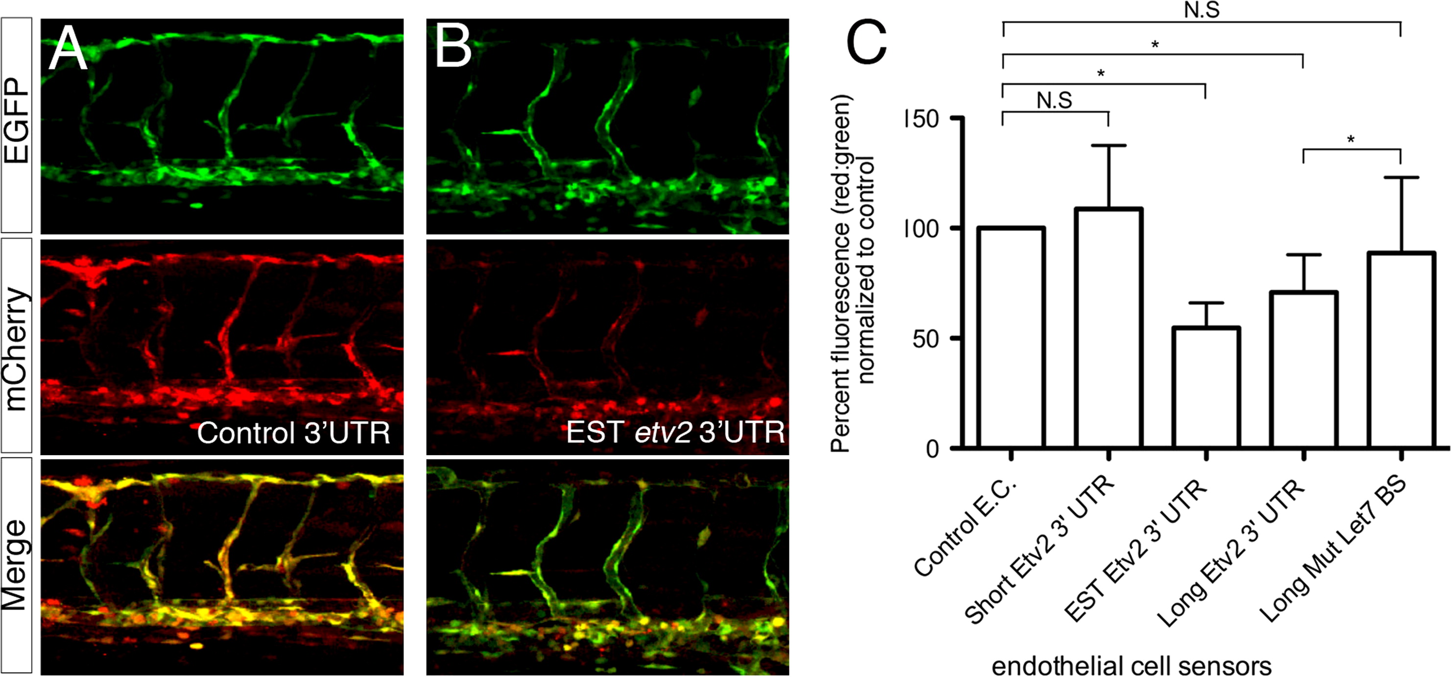 Fig. 3 The etv2 3′UTR represses a heterologous reporter in endothelial cells. (A, B) Representative confocal micrographs of 48 hpf wild type embryos co-injected with 25 pg of transposase mRNA and 25 pg of a Tol2 bis-cistronic endothelial cell autonomous sensor construct encoding mCherry fused to a (A) control 3′UTR or the (B) EST etv2 3′UTR sensor. (Top) Endothelial expression of the control EGFP transgene. (Middle) Endothelial expression of the mCherry sensor transgene. (Bottom) Merge of green and red channels. Lateral views, dorsal is up, anterior to the left. (C) Quantification of relative mCherry fluorescence levels compared to EGFP following 3′ UTR sensor injection. *p<0.05, N. S.=Not significant.