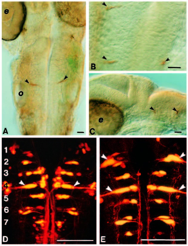 Fig. 7 Duplication of the Mauthner neuron occurs in r2 in Hoxa-1- injected embryos. (A-C) 24 hour old embryos stained with the 3A10 antibody. In control embryos (A), a single pair of Mauthner cells is evident in r4 (arrowheads). In injected embryos (B,C), an additional Mauthner cell is seen more rostrally. Anterior is up in A and B and to the left in C. (D,E) Confocal images of hindbrains from larvae that have had lysinated rhodamine dextran crushed onto their spinal cords in order to retrogradely label reticulospinal neurons. (D) Control with the different rhombomeres (numbered) evident from the segmental arrangement of the neurons. The Mauthner neurons is arrowed. Duplicated Mauthner cells are evident in r2 in the injected embryo shown in E. o, otic vesicle; e, eye. Scale bar, 100 μm.