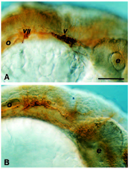 Fig. 9 The preotic cranial ganglia are abnormally formed in Hoxa-1- injected embryos. This is seen by comparing 24 hour embryos stained with anti-acetylated tubulin to reveal the VIIth and Vth ganglia between the otic vesicle (o) and the eye (e). In control embryos (A), these ganglia are distinct but, in embryos injected with Hoxa-1 (B), they are reduced and fused into one ganglion immediately anterior to the otic vesicle. Scale bar, 100 μm.