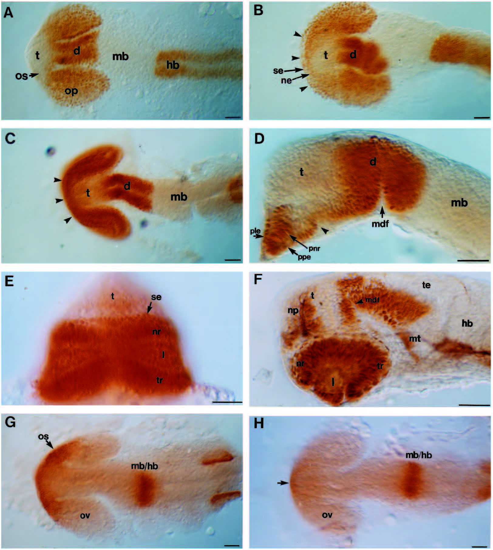 Fig. 2 Pax protein distribution in wild-type and cyclops mutant embryos. Whole-mounted embryos labelled with anti-Pax6 antibody (A-F), or labelled with anti-Pax2 antibody (G,H). (A,B) Dorsal views of 15-16s wild-type and cyclops embryos respectively. The arrowheads in B indicate the bridge of rostral retinal fusion. (C,D) Dorsal and lateral (focused on the midline) views respectively of 20s cyclops embryos. The arrowheads indicate the area of retinal fusion in C. In D the lateral portions of the cyclopic eye have been removed. The arrowhead indicates the caudal limit of eye fusion. (E) Frontal view of 28s cyclops mutant embryo. (F) Lateral view of 28 hour cyclops mutant embryo also labelled with anti-tubulin antibody (black labelling of axons). This embryo was also examined in a different study (Macdonald et al., 1994). (G,H) 18- 20s dorsal views of wild-type (G) and cyclops (H) embryos labelled with anti-Pax2 antibody. The arrow in H indicates a few cells near the midline weakly labelled with anti-Pax2 antibody. Abbreviations: d, diencephalon; hb, hindbrain; mb, midbrain; mdf, mid-diencephalic furrow; l, lens; mt, midbrain tegmentum; ne, neural ectoderm; nr, nasal retina; os, optic stalks; np, nasal placode; op, optic primordia; ov, optic veiscle; ple, presumptive lens ectoderm; pnr, presumptive neural retina; ppe, presumptive pigment epithelium; se, surface ectoderm; t, telencephalon; te, tectum; tr, temporal retina; vd, ventral diencephalon. Scale bars, 50 μm.