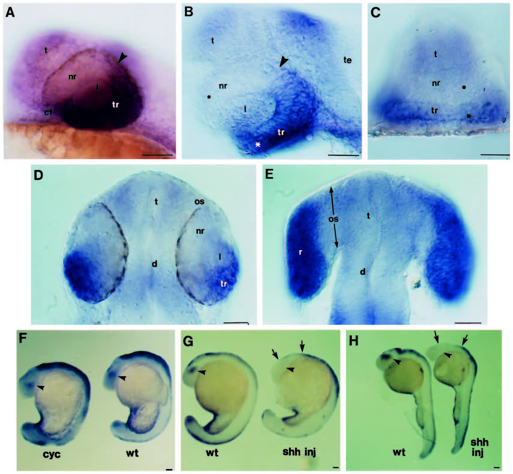 Fig. 3 rtk2 and msxC expression in wild-type, cyclops and shh-injected embryos. Whole-mounted embryos with rostral to the left (A,B,F-H) or up (D,E). (A,B) Lateral views of rtk2 expression in 24 hour wild-type (A) and cyclops mutant (B) embryos. The arrowheads indicate the boundary between nasal and temporal retina at the posterior groove. The asterisk and filled circle indicate equivalent positions of the eye in B and C. (C) Frontal view of rtk2 expression in a 20s cyclops mutant embryo. rtk2 expression in temporal retina is continuous around the rostral pole of the brain. (D,E) Dorsal views of rtk2 expression in 24 hour wild-type and shh-injected embryos respectively. rtk2 expression is widespread thoughout the retinal tissue in the shh-injected embryo. (F) Lateral views of msxC expression in the eye (arrowheads) of wild-type (right) and cyclops mutant (left) 18s embryos. (G,H) Lateral views of msxC expression in the eyes of shh injected (right) and wild-type (left) 18-20s (G) and 24 hour (H) embryos. In addition to an absence of msxC expression in the eyes (arrowheads), msxC is reduced throughout the head (arrows). Abbreviations: cf, choroid fissure; d, diencephalon; l, lens; nr, nasal retina; os, optic stalk; t, telencephalon; te, tectum; tr, temporal retina. Scale bars, 50 μm.