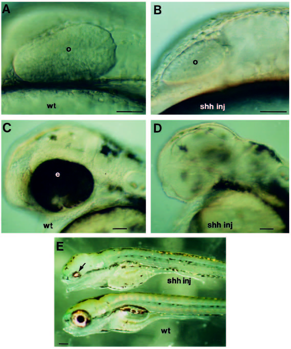 Fig. 4 Development of the eye in living wild-type embryos and embryos injected with shh RNA. Lateral views with rostral to the left. (A,B) 10-12s, wild-type and injected embryos respectively. (C,D) 48 hour, wild-type and injected embryos respectively. The injected embryo has virtually no pigment epithelium and very little neural retina. (E) Comparison of injected (upper) and wild-type (lower) embryos at 3-4 days of development. The arrow indicates the much reduced retina in the injected embryo. Abbreviations: e, eye; o, optic primodium. Scale bars, (A-D) 50 μm; (E) 200 μm.
