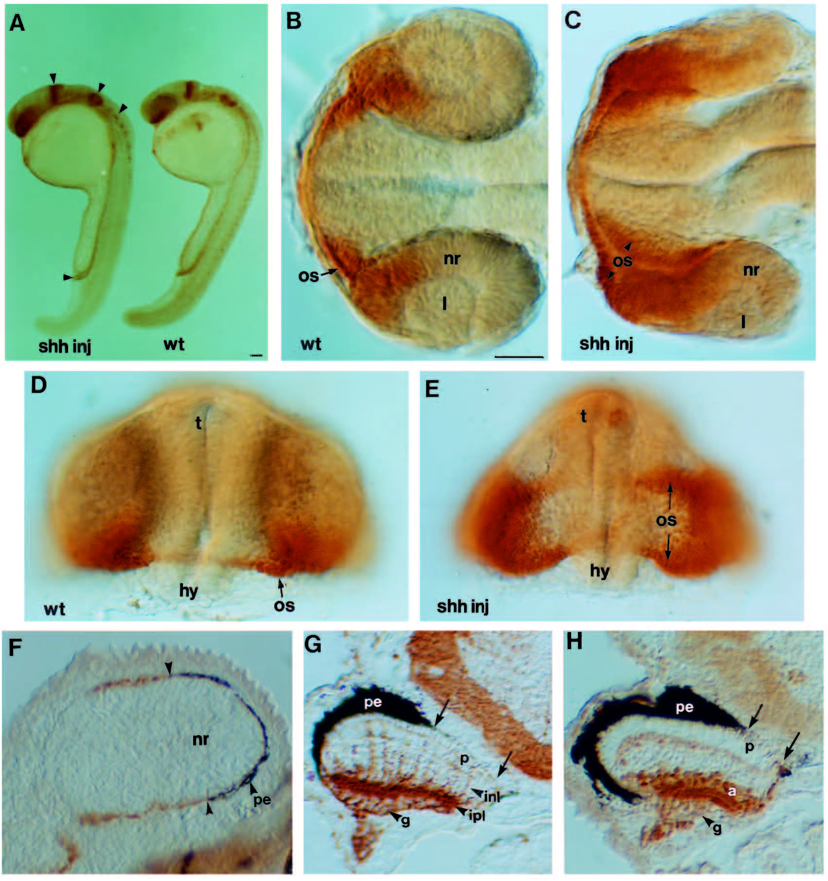 Fig. 6 Altered Pax protein distribution correlates with abnormal segregation of the optic primordia into optic stalks and retinae in embryos injected with shh RNA. Rostral is to the left in A-C and F. All embryos in this figure showed only moderate reduction in the extent of the retinal tissue. Embryos are labelled with anti-Pax2 (A-F), HNK1 (G) or anti-Pax6 (H) antibodies. (A) Lateral views of 24 hour injected (left) and wild-type (right) embryos. The arrowheads indicate sites of Pax2 expression at the midbrain/hindbrain boundary, in the otocysts, in hindbrain neurons and in the nephric duct. (B,C) Ventral views of wild-type (B) and injected (C) embryos. (D,E) Frontal views of wild-type (D) and injected (E) embryos. The arrows in E indicate the expansion of Pax2 expression in the optic stalk region of the injected embryo. (F) Horizontal section through the retina of an shh-injected embryo at 2 days of development. The distal extent of Pax2 distribution (arrowheads) is coincident with the proximal limit of pigment epithelium formation. Most of the cells in the deeper layers of the retina still contained Pax6 at this stage as judged by anti-Pax6 labelling of adjacent serial sections. (G,H) Frontal sections through the retina of an shhinjected 5-day old fish labelled with HNK1 antibody (G; brown labelling of axons) or anti-Pax6 antibody (H). At this stage Pax6 protein is restricted mainly to amacrine cells (Macdonald and Wilson, unpublished observations). The antibody labelling reveals relatively normal lamination of the neural retina. The arrows indicate medial regions of the neural retina over which there is no pigment epithelium. Abbreviations: a, amacrine cell layer; g, ganglion cell layer; hy, hypothalamus; inl, inner nuclear layer; ipl, inner plexiform layer; l, lens; nr, neural retina; os, optic stalk; p, photoreceptor layer; pe, pigment epithelium; t, telencephalon. Scale bars, 50 μm.