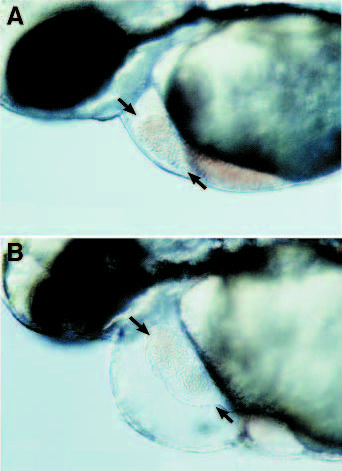 Fig. 4 Injection of Nkx2.5 mRNA (100 pg) causes an enlarged heart. The atrium of (A) lacZ-injected and (B) Nkx2.5- injected embryos (arrows point to the border of the atrium). Embryos are oriented with dorsal to the top and anterior to the left.