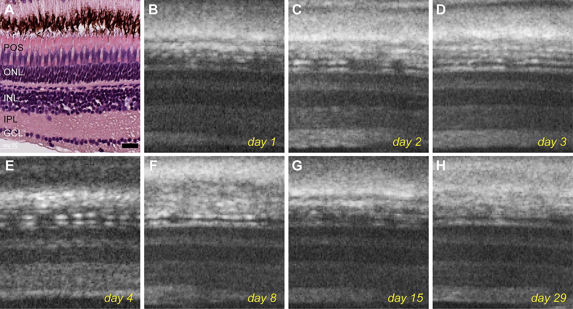 Live imaging of an untreated control fish over the course of 29 days. A: Histological staining of an untreated retina shows typical retinal layer structure. B–H: OCT images of the same fish acquired over 1 month shows no change in retinal structures. Scale bar represents 20 μm.