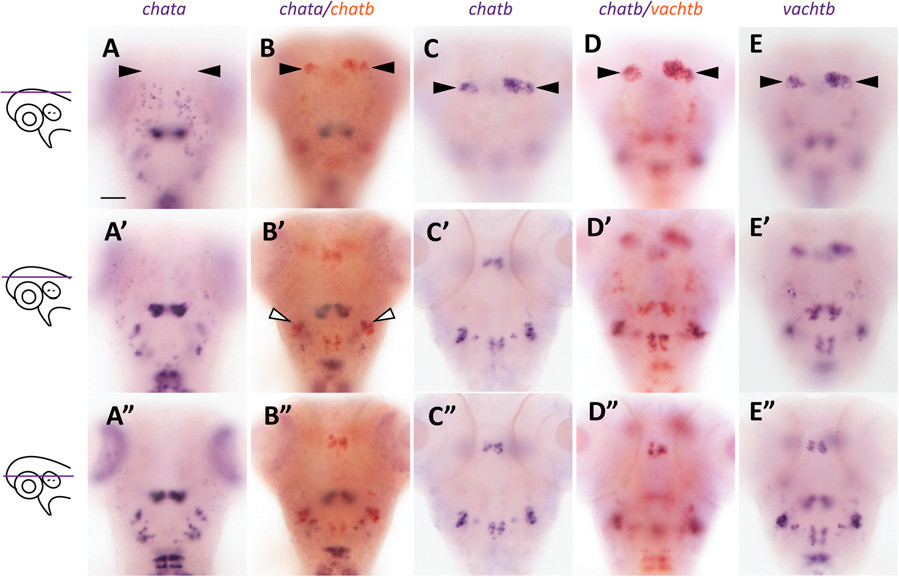 Coexpression of chatb with chata and vachtb. Single and double ISH for chata (A–A22), chata/chatb (B–B22), chatb (C–C22), chatb/vachtb (D–D22), and vachtb (E–E22) in 4-d postfertilization (dpf) larvae, imaged at the designated focal plane (at left). (A–E) Arrowheads mark the Hb. (B2) White arrowheads indicate chata and chatb coexpression in hindbrain neurons. (Scale bar: 50 μm.)