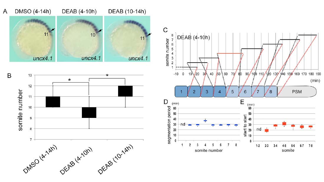 Fig. S6 Inhibition of RA synthesis during gastrulation results in loss of a somite. (A) Representative images of uncx4.1 expression in embryos treated with DMSO (4 – 14 hpf) (left), DEAB (4 – 10 hpf) (center) or DEAB (10 – 14 hpf) (right). Lateral view, anterior to the left. Arrows marked the position at SI. (B) Box and whisker plots of somite number in embryos treated with DMSO (4 – 14 hpf) (n = 34), DEAB (4 – 10 hpf) (n = 29) or DEAB (10 – 14 hpf) (n = 25). Statistically significant difference (asterisk, P < 0.05) could be seen in DMSO versus DEAB (4 – 10 hpf), and DEAB (4 – 10 hpf) versus DEAB (10 – 14 hpf). (C) Time-lapse data for somitogenesis in an embryo treated with DEAB (4 – 10 hpf) (see Movie 4, 4-1). (D, E) Box and whisker plots of segmentation period (D) or start to start (E) for embryos treated with DEAB during 4 – 10 hpf (n = 8). Results from statistical analyses are shown in Table S1 – 4.