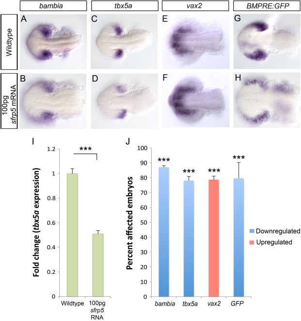 Overexpressing a high dose of sfrp5 mRNA results in loss of dorsal and increase in ventral retina identity. Using in situ hybridization, we analyzed dorsal markers bambia and tbx5a and the ventral marker vax2 at 15 hpf in embryos injected with 100 pg sfrp5 mRNA. Compared to WT, the levels of both tbx5a and bambia expression are significantly reduced in sfrp5 mRNA injected embryos (A–D) while vax2 shows both an increase in expression levels and an expansion of the domain (E–F). We measured BMP signaling using the Tg(BMPRE-AAV.Mlp:eGFP) transgenic strain, which is abbreviated BMPRE:GFP. In situ hybridization for eGFP mRNA in 15 hpf embryos injected with 100 pg sfrp5 mRNA indicates a decrease in BMP signaling compared to wildtype (G–H). Prevalence of change in expression for all probes was quantified and significance was assessed using Fisher′s Exact Test (J,NNN, p<0.0001). qRT-PCR results for tbx5a expression at 15 hpf in sfrp5 mRNA injected embryos indicate a 0.5 fold change in expression (I, NNN, p<0.0001, Student′s t-test).