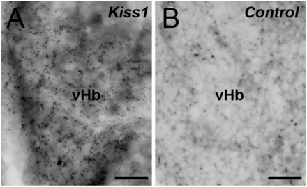 Fig. 2 Effect of administration of Kiss1 on c-fos mRNA expression in the habenula. Effect of Kiss1 decapeptide (1011 mol per fish) (A) or water (B) on the expression of c-fos mRNA in the vHb. Expression of c-fos mRNA in the vHb is seen as black grains with the DAB substrate. (Scale bars, 20 µm.)