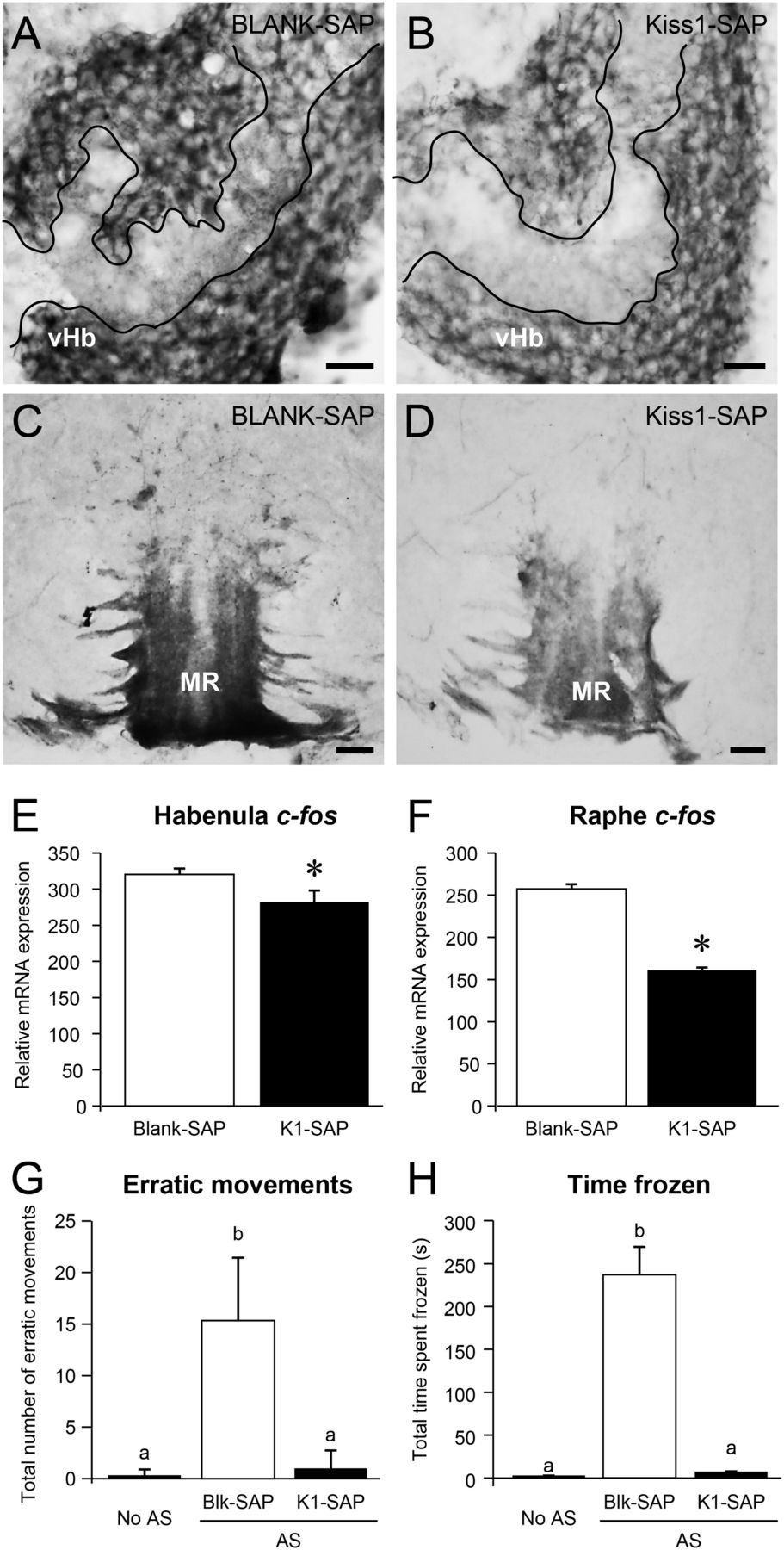 Fig. 6 Effect of Kiss1-SAP on Kiss1 immunoreactivity, on c-fos mRNA expression levels in the habenula and the median raphe, and on AS-evoked fear response. (A–D) Transverse sections of Kiss1 immunoreactivity in the ventral habenula (vHb; A and B) and the median raphe (MR; C and D) in the brain of zebrafish injected with Blank-SAP (A and C) or Kiss1-SAP (B and D) at 12 d after injection (103 mol per fish; intracranial administration, n = 3 per group). Kiss1 immunoreactive fibers were relatively reduced in the area of neuropil of the vHb (encircled by white lines) in Kiss1-SAP-treated fish compared with the Blank-SAP group (A and B). Kiss1 immunoreactive axons entering the MR were relatively weak, and fewer fibers were seen in the superior raphe regions in Kiss1-SAP-treated fish compared with in the Blank-SAP group (C and D). (Scale bars, 20 µm.) (E and F) Graphs showing the effect of Kiss-SAP on mRNA levels of c-fos in the habenula (E) and raphe (F) regions at 3 d after injection (n = 10 per group). (G and H) Graphs of behavioral parameters of fear response: the number of erratic movements (G) and the freezing time (H) in the zebrafish injected with Blank-SAP (open column) or Kiss1-SAP (closed column) (105 mol per fish; intracranial administration, n =10 per group) at 3 d after injection. Behavior data of control (no AS, fish treated with distilled water) are provided for comparison. Data are presented as mean ± SEM. Significant differences (P < 0.05) between groups are indicated by different letter codes; one-way ANOVA followed by post hoc Tukey’s test.