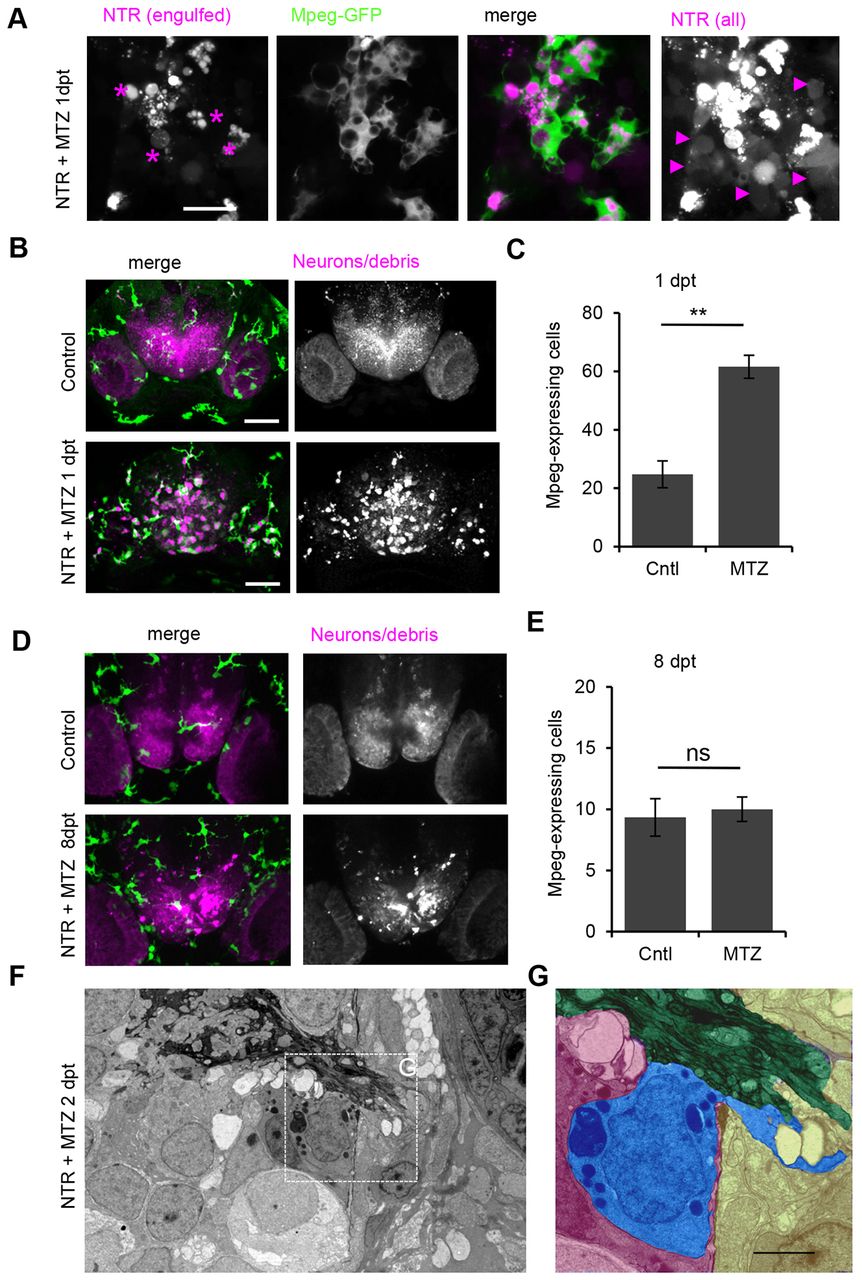 Phagocytic responders are mononuclear phagocytes. (A) Macrophage-expressed gene 1 (mpeg1)-driven GFP expression-positive phagocytes with amoeboid morphology in NTR-ablated larva 1 day post-treatment. (B) mpeg1-GFP expression in forebrain of control and treated larvae showing that mpeg1-positive (green) leukocytes co-localize with phagocytized debris in NTR animals treated with MTZ (also see supplementary material Movie 7). (C) Number of mpeg-expressing cells in control forebrain (n=4) and increased numbers in NTR MTZ-treated larvae (n=7) (Pd0.01). (D) mpeg-GFP expression in NTR control and treated larvae 8 days post-ablation. (E) Number of mpeg-expressing cells in control forebrain (n=3) and similar numbers in NTR larvae treated with MTZ (n=3) 8 days post-ablation, quantified from 80 μm z-stacks. (F) Electron micrograph of forebrain 2 days post-treatment showing olfactory nerve entering the brain. (G) False color high magnification view of phagocyte (blue) in F next to olfactory nerve (green) within meninges, with extended cytoplasmic process protruding outside of brain (blue). Error bars indicate standard deviation. **Pd0.01; ns, not significant. Scale bars: 10 μm (A), 50 μm (B,D), 2 μm (G). See also supplementary material Movies 7, 8.