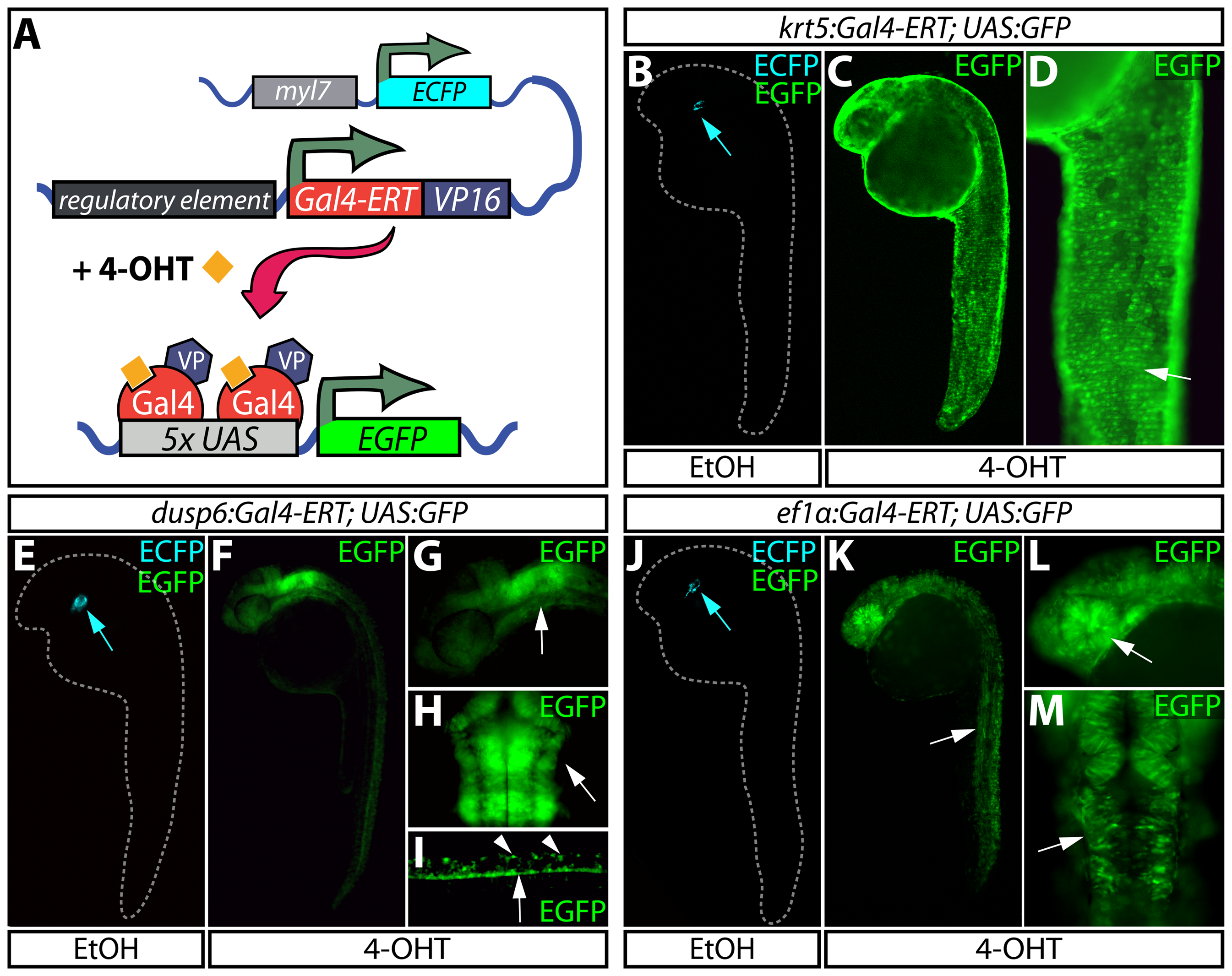 (A) Schematic of transgenic constructs used in the Gal4-ERT system. A tamoxifen-responsive Gal4-ERT-VP16 construct is expressed from a tissue-specific promoter that activates any UAS-linked responder line (shown here as a 5xUAS:EGFP reporter) upon tamoxifen or 4-OHT exposure (orange squares). The myl7:ECFP cassette serves as a transgenesis marker for the Gal4-ERT lines. (B–D) Visualization of EGFP expression in Tg(krt5:Gal4-ERT-VP16; UAS:EGFP) animals treated with ethanol (B) or 2 μM 4-OHT (C and D) from 4–24 hpf. The white arrow in panel D highlights expression of EGFP in the epidermis. (E–I) EGFP expression in Tg(dusp6:Gal4-ERT-VP16; UAS:EGFP) animals treated with vehicle (E) or 2 μM 4-OHT (F-I) from 4–24 hpf. In panels G and H, the white arrow indicates EGFP expression in the hindbrain and midbrain-hindbrain boundary. In panel I, arrowheads mark dorsal spinal cord neurons and the arrow points to EGFP expression in the floor plate. (J–M) Expression of EGFP in control (J) and 4-OHT treated (2 μM, K-M) Tg(ef1α:Gal4-ERT-VP16; UAS:EGFP) animals in a variety of cell types throughout the embryo including skeletal muscle (K, white arrow), the eye (L, white arrow), and the midbrain/midbrain-hindbrain boundary (M, white arrow). In panels B, E, and J, blue arrows point to myocardial ECFP expression, which represents the marker for transgenesis and serves as an internal control.