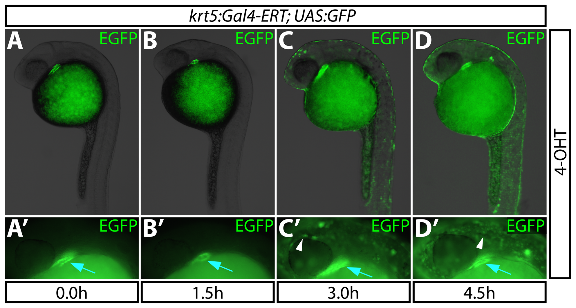 (A–D) Kinetics of EGFP expression in Tg(krt5:Gal4-ERT-VP16; UAS:EGFP) animals upon administration of 2 μM 4-OHT at 24 hpf for 0–4.5 hours. (A2–D2) High magnification images demonstrating EGFP expression for each treatment. White arrowheads point to epidermal expression of EGFP; blue arrows indicate bleed-through from the heart muscle-specific ECFP transgenesis marker.