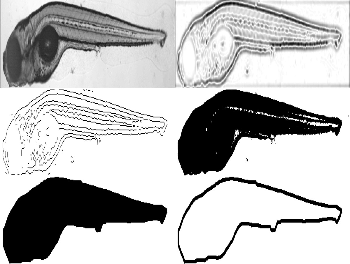 Segmentation of a DIC image. Top left: grayscale image with inverted grayscale values. Top right: Image filtered with LoG. Middle left: Result from LoG edge detection. Middle right: Result from Otsu′s threshold. Bottom left: Segmented image after all steps, including morphological closing. Bottom right: Outline of the fish.