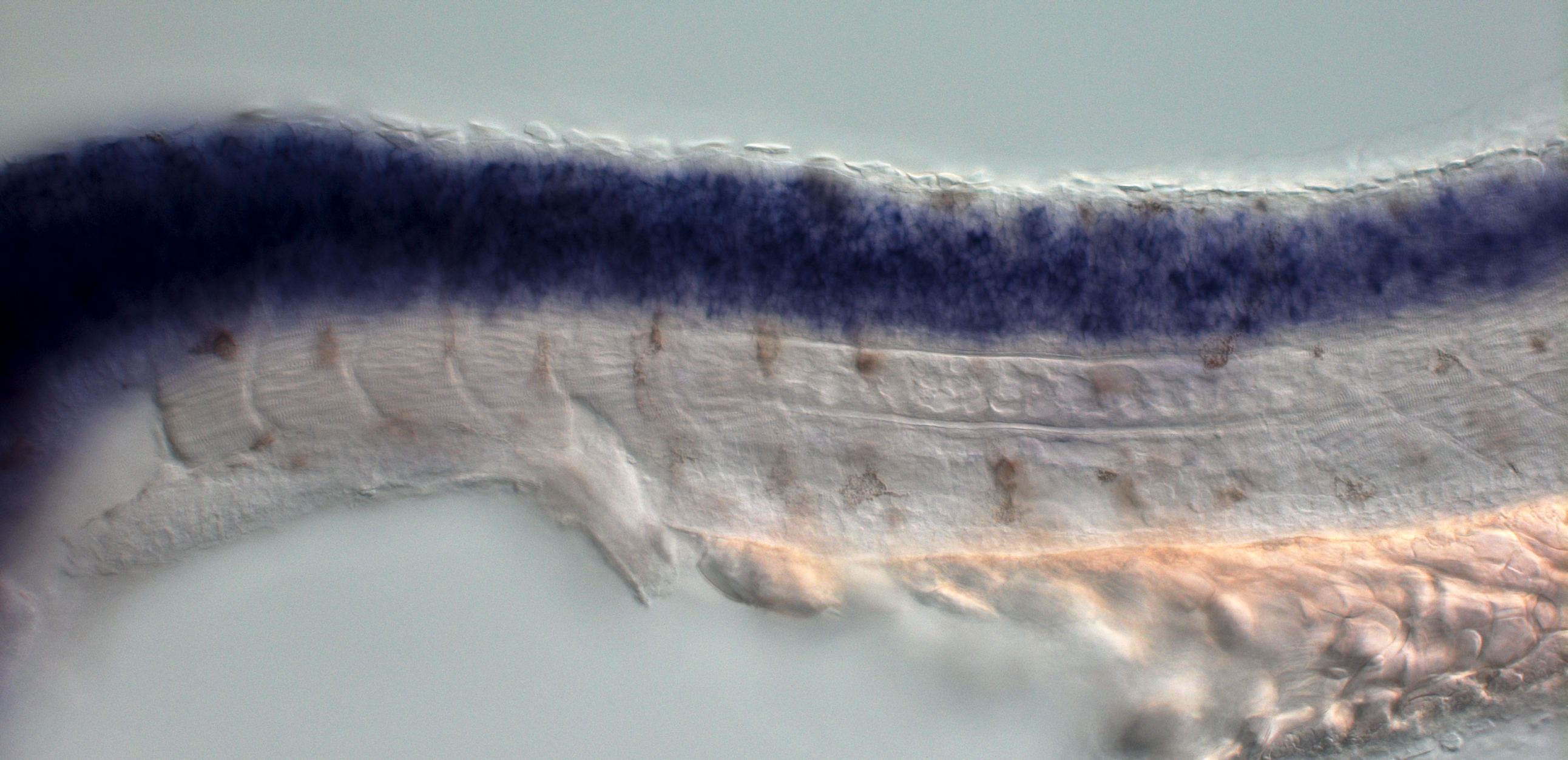 Fig. 13 Wild-Type. Prim-10 (27 hpf). Probe synthesis and in situ hybridisation was performed as described in England et al., Identifying Transcription Factors Expressed by Ventral Spinal Cord Interneurons. ZFIN on-line publication, 2014. Primer sequences were: Forward: GGATCAATCAGCAGCAGAGAAAC. Reverse: AATTAACCCTCACTAAAGGGAGGTCATCCTTTACATGCAGAGC. PCR product size: 1055 bp.