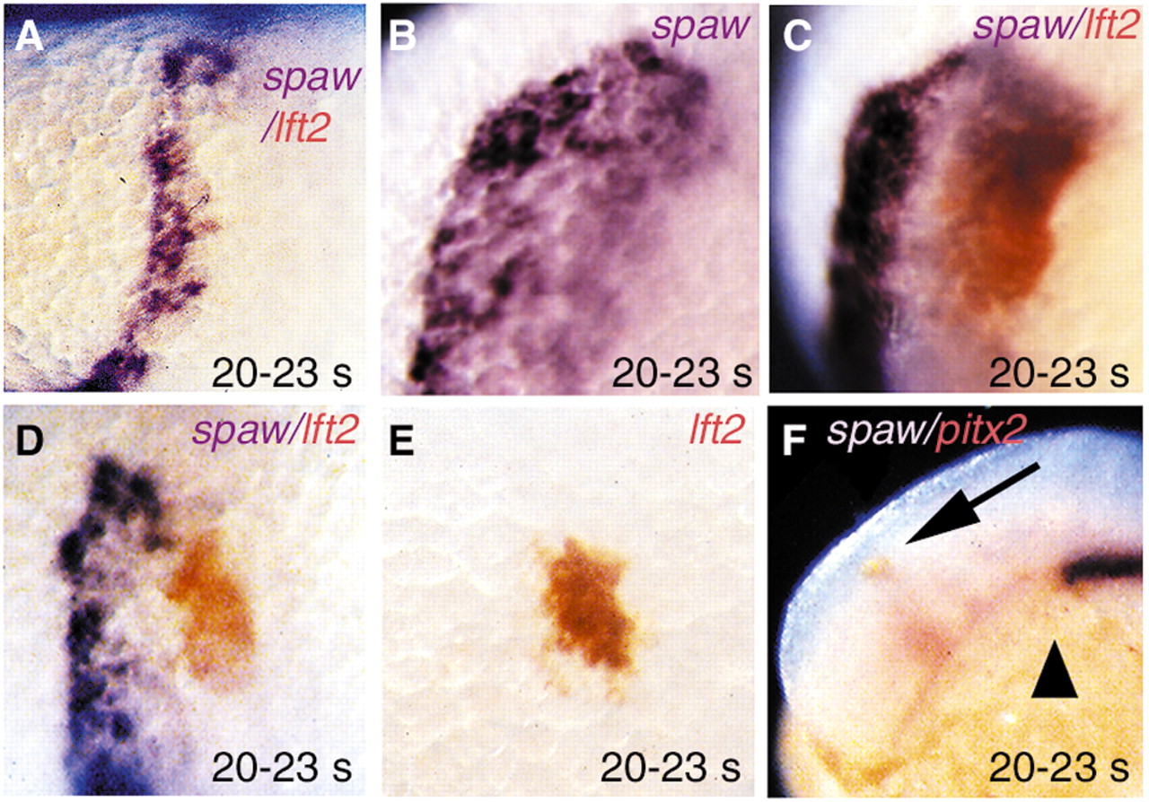 Fig. 3 Comparison of spaw with lefty2 and pitx2. (A,C,D) Dig-spaw (purple) + DNP-lefty2 (red) probes. Dorsal close-up; A is at a lower magnification than C and D; lefty2 marks the heart field. (A,C,D) The patterns seen in embryos from a pool of 20-23 somite embryos. (A) spaw is expressed in this embryo but lefty2 is not. The converse pattern (lefty2+,spaw–) was never seen. (B) Dig-spaw probe alone, 20-23 somite stage. Dorsal close-up near heart field. Comparison of B (spaw probe) with C (spaw + lefty2 probes) emphasizes the extensive overlap between the left-sided spaw and lefty2 expression domains in C. (D) Asymmetric spaw and lefty2 zones are present as largely non-overlapping domains. (E) Dorsal close-up. DNP-lefty2 probe (red) only, 20-23 somite embryo. (F) Twenty to 23 somite embryo. Dig-spaw (purple) + DNP-pitx2 (red) probes. Lateral view, anterior towards the left, comparing the anterior border of spaw (black arrowhead) in the lateral plate with the anterior position of left-sided pitx2 (arrow) in the diencephalon.