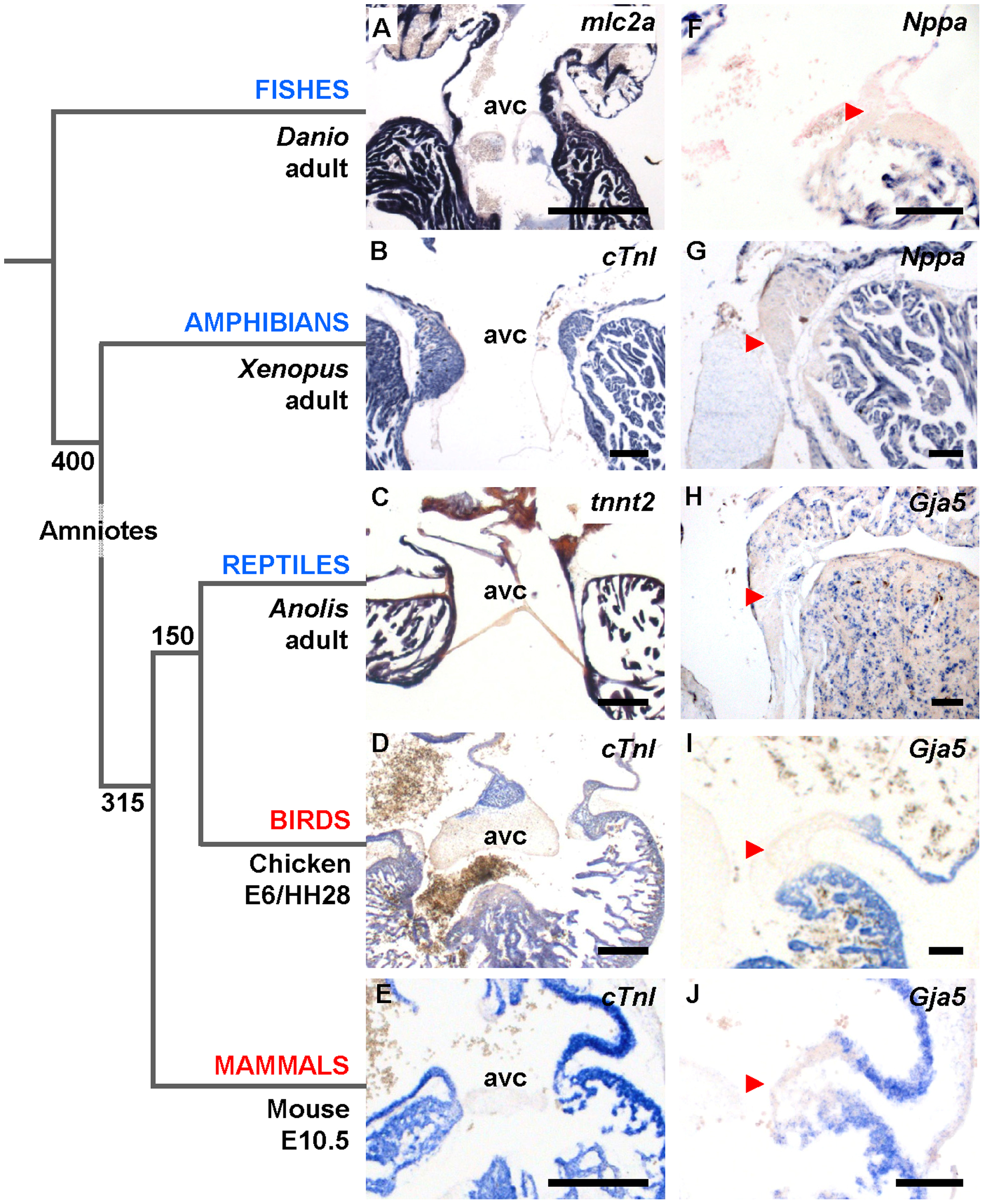 Numbers in the phylogenetic tree indicate time in millions of years since major splits in tetrapod evolution. (A–E) The hearts of mature ectotherms (blue) and embryonic endotherms (red) maintain complete muscular connection in the atrioventricular canal (avc). (F–J) Markers of fast propagating chamber myocardium (Nppa and Gja5) are absent from the atrioventricular canal (arrowheads). Note that the specimen in H is contracted, obscuring the spongy design otherwise visible. Scale bars in (A–E), 300 μm; (F–J), 100 μm.