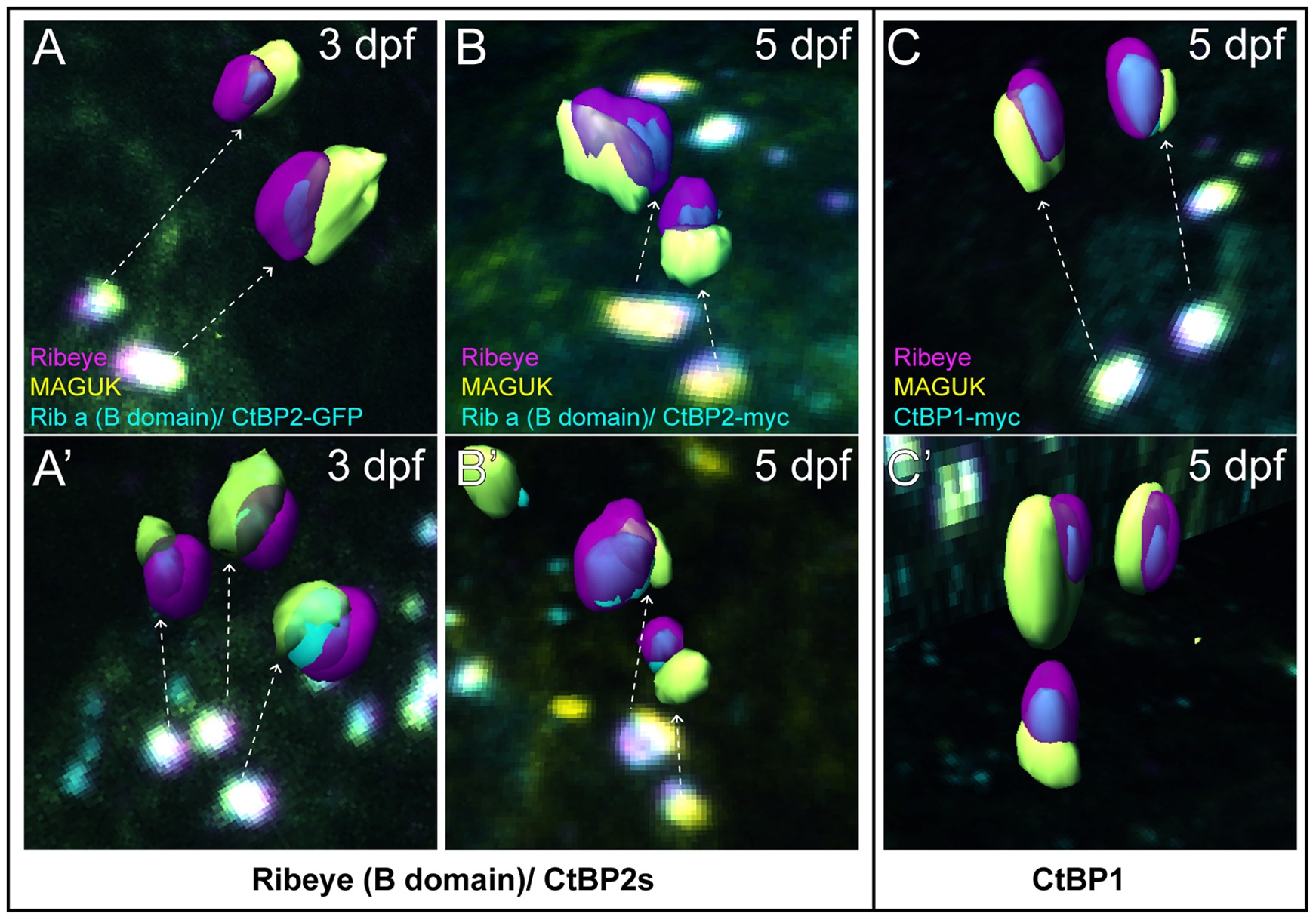 Isosurface renderings of ribbon synapses extrapolated from z-stack confocal images of Ribeye b (magenta), GFP or myc (cyan), and MAGUK (yellow). Dashed arrows indicate the ribbon synapses used from the images to generate the 3D renderings. (A–A′) Ribeye (B-domain)-GFP (cyan) with Ribeye b (magenta), and MAGUK (yellow) in 3 dpf larvae. Note that B-domain-GFP within synaptic ribbons appears adjacent to patches of MAGUK. (B–B′) Ribeye (B-domain)/CtBP2s-myc (cyan) with Ribeye b (magenta), and MAGUK (yellow) in 5 dpf larvae. Note that B-domain-myc within synaptic ribbons also appears adjacent to patches of MAGUK. (C–C′) CtBP1-myc (cyan) with Ribeye b (magenta), and MAGUK (yellow) in 5 dpf larvae. Synaptic ribbon localization of CtBP1 appears comparable to Ribeye (B-domain)/CtBP2s.