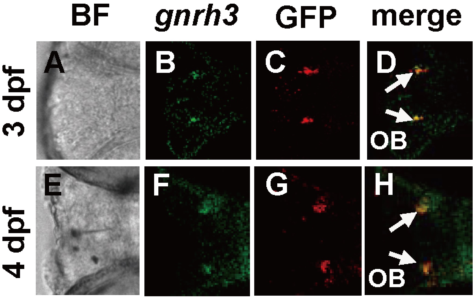A–D, 3 dpf, E–H, 4 dpf. A and E, bright field (BF) view of the embryos. B and F, green color indicated gnrh3 mRNA detection by in situ hybridization. C and G, GFP immunostaining is shown as red signal. D and H, the merged pictures show co-localization of gnrh3 and GFP signals in the olfactory bulb (OB) at 3 dpf and 4 dpf. The anterior is to the left in all panels, and arrows point to the olfactory bulb.