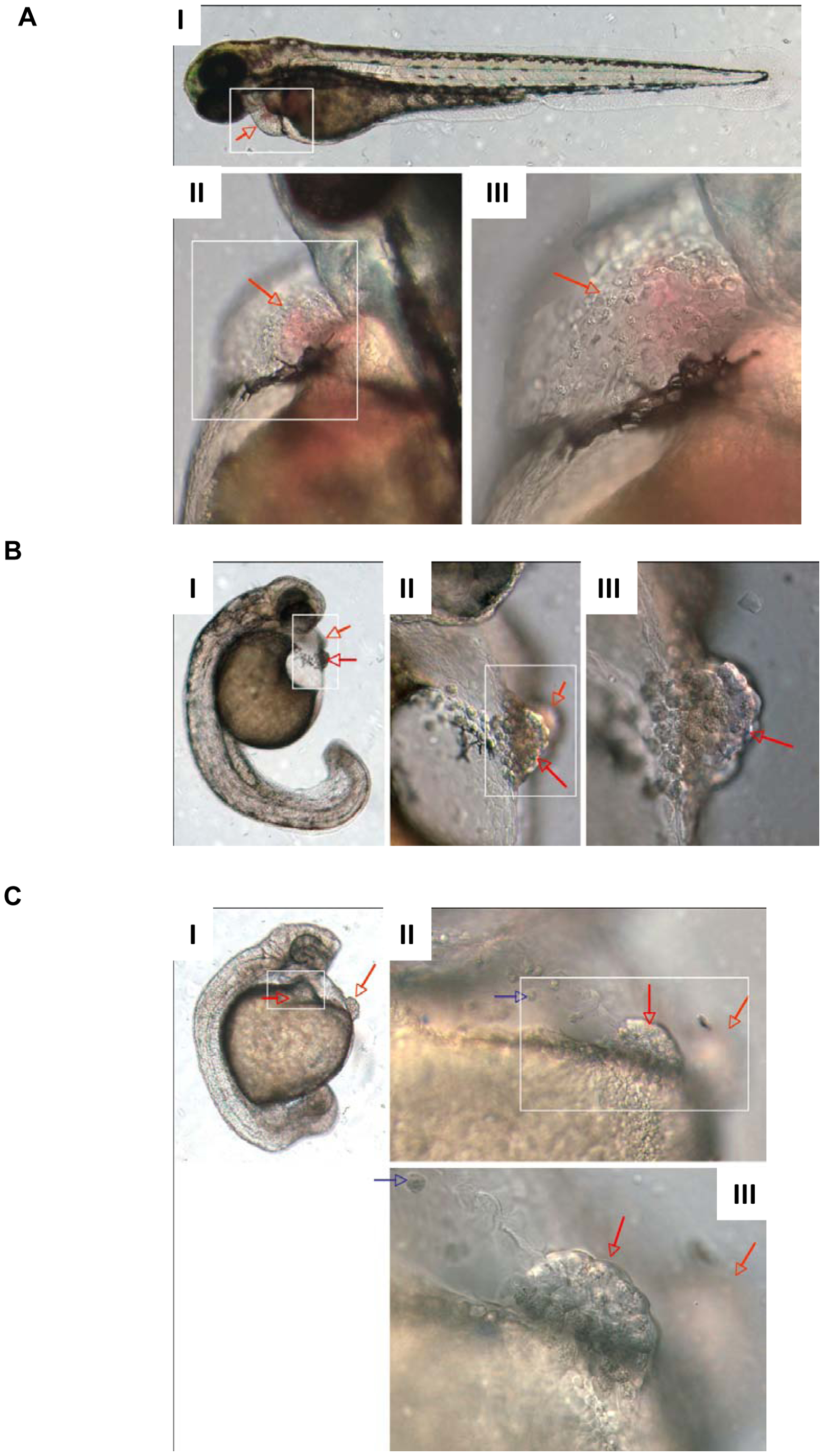 DIC microscopy images of the hatching glands of dechorinated 52 hour post fertilisation embryos. In each panel (A–C) I is x5 objective, white box indicates frame of II. II is x20 objective, white box indicates frame of III. III is x40 objective. II and III are montages of more than one focal plane. Red arrows point to the hatching gland, blue arrows indicate mislocalised hatching gland cells. A: Hatching gland typical of a LWT embryo. I is a montage of more than one focal plane. B: Moderately disrupted hatching gland typical after injection of 10 pg of MO4. C: Severely disrupted hatching gland typical after injection of 12 pg of MO4.
