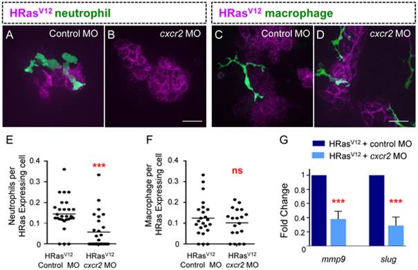 (A–B) Fluorescent Z stack projections of live 3.5 dpf transgenic mpx:GFP (green neutrophils) control MO injected (A) and cxcr2 morphant (B). (C–D) Fluorescent Z stack projections of live 3.5 dpf transgenic mpeg:Dendra (green macrophages), control MO injected (C) and cxcr2 morphant (D). (E) Quantification of A–B (as a ratio of neutrophils per transformed cell) reveals a significant decrease in neutrophil recruitment to HRasV12 expressing cells in cxcr2 MO injected larvae compared to control. (F) Quantification of C–D (as a ratio of macrophages per transformed cell) shows that macrophage numbers at HRasV12 expressing cells in cxcr2 MO injected larvae is similar to macrophage numbers at HRasV12 expressing cells in control larvae. (G) Quantitative RT-PCR (one representative graph shown n = 4) indicates a statistically significant decrease in mmp9 and slug transcripts in transformed cells from cxcr2 MO injected larvae when compared to control MO injected larvae. *** = P<.001, ns = not significant. Scale bar = 20 microns.