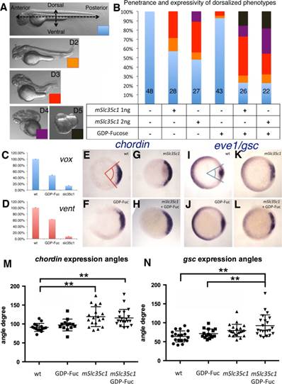 Fig. 2 Elevated N-fucosylation dorsalizes zebrafish embryos. (A) Variable degrees of dorsalization in embryos over-expressing mSlc35c1. (B) Quantification of the severity and penetrance of dorsalization in each treatment. (C and D) qPCR of the ventral transcriptional factors vox and vent in WT, GDP-Fuc injected or mSlc35c1 expressing embryos. (E–L) in situ hybridization with dorsal (chordin and gsc) and ventral (eve1) specific markers at shield stage (6hpf). (E–H) chordin expression in treated embryos (I–L) eve1 and gsc expression. The expression angles of chordin and gsc of embryos with each treatment are summarized in (M) and (N) respectably. The sample sizes for each treatment are as follows: wt (N=15), GDP-Fuc(N=13), mSlc35c1(N=18) and mSlc35c1 plus GDP-Fuc (N=21) for (M); and wt (N=19), GDP-Fuc (N=15), mSlc35c1(N=21) and mSlc35c1 plus GDP-Fuc (N=22) for (N). For chordin angle, ordinary One-way ANOVA between sample group means, p=0.0002. For gsc angle, ordinary One-way ANOVA between sample group means, p=0.0001. Note: ** Tukey′s procedure after ANOVA p<0.01. Null hypothesis for Χ2 between embryos injected with 1 ng mSlc35c1 and with GDP-Fuc plus 1 ng mSlc35c1 p=1.41E-04; for Χ2 between embryos injected with 2 ng mSlc35c1 and with GDP-Fuc plus 2 ng mSlc35c1 p=8.99E-03.