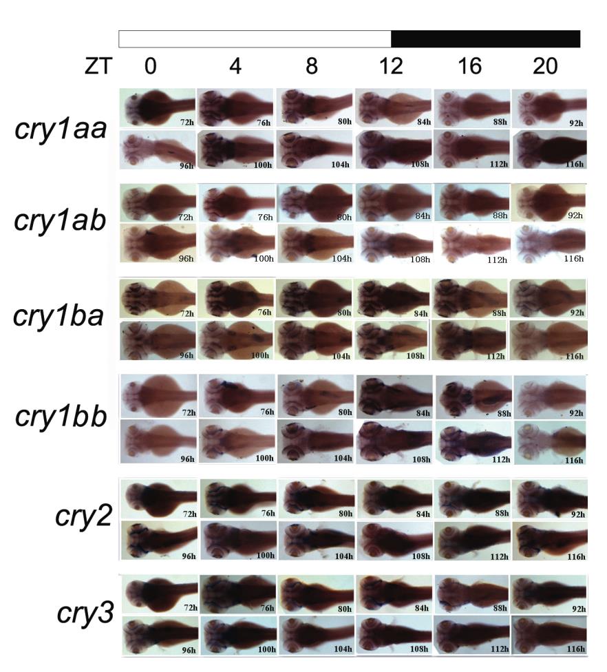 Zebrafish cry1aa, cry1ab, cry1ba, cry1bb, cry2 and cry3 display diverse and rhythmic expression patterns in larvae. Whole-mount in situ hybridization was performed to examine expression patterns of six cry genes from 72 hpf to 116 hpf (Day 4 and Day 5, at 4 h intervals each day).