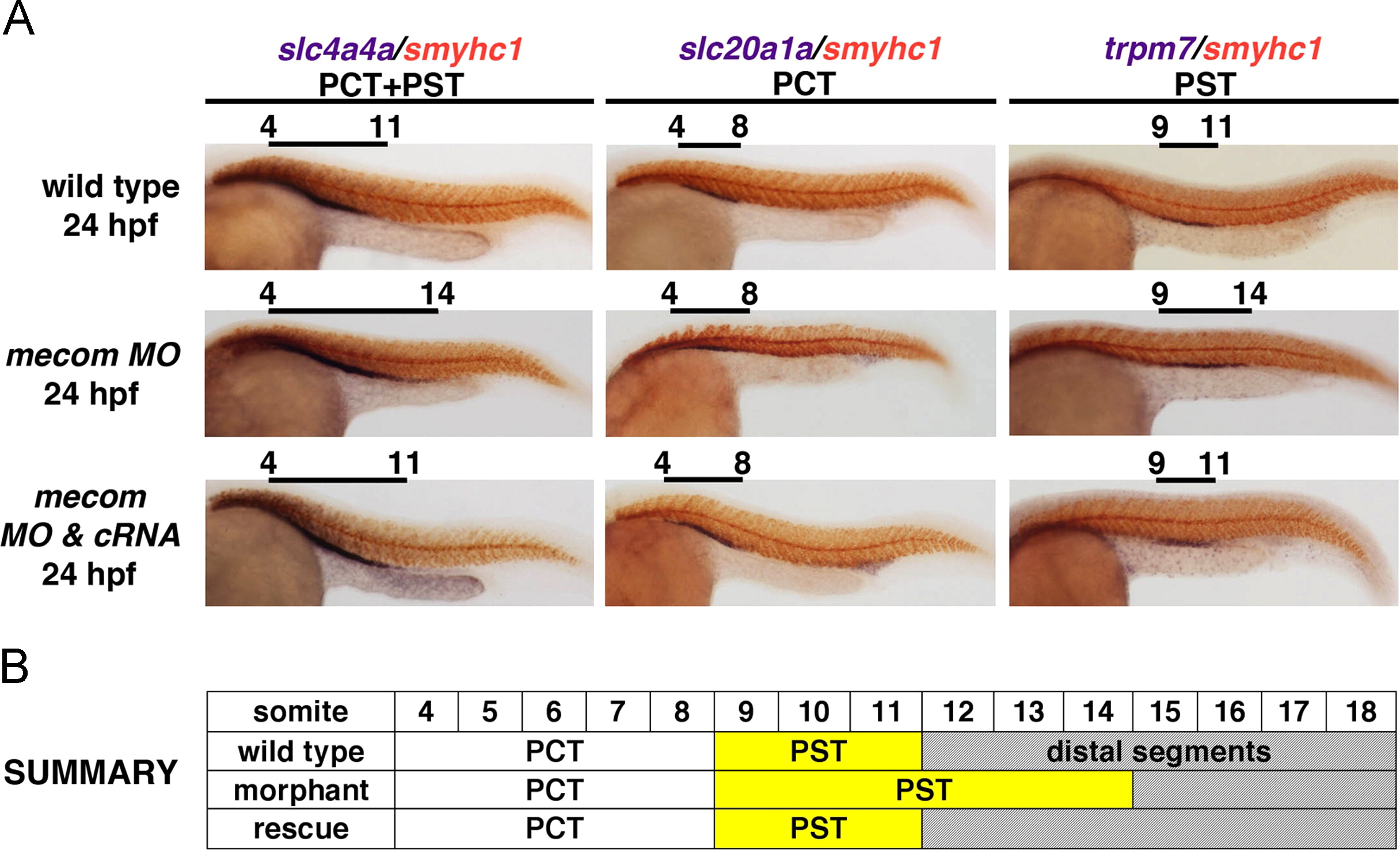 mecom knockdown leads to an expanded PST segment. (A) At 24 hpf, WISH indicates proximal segments marked by slc4a4a elaborated in mecom morphants. Within proximal domains, PCT labeled by slc20a1a was not affected compared with wild type embryos. Knockdown of mecom induced a 3-somite expansion in trpm7-expressing PST in morphant pronephros at 24 hpf, which could be rescued by co-injecting mecom cRNA along with mecom morpholinos. (B) Schematic summary of proximal segment organization in wild type, mecom morphant, and mecom rescued embryos, with PST alterations highlighted in yellow. Abbreviations: PCT (proximal convoluted tubule), and PST (proximal straight tubule).