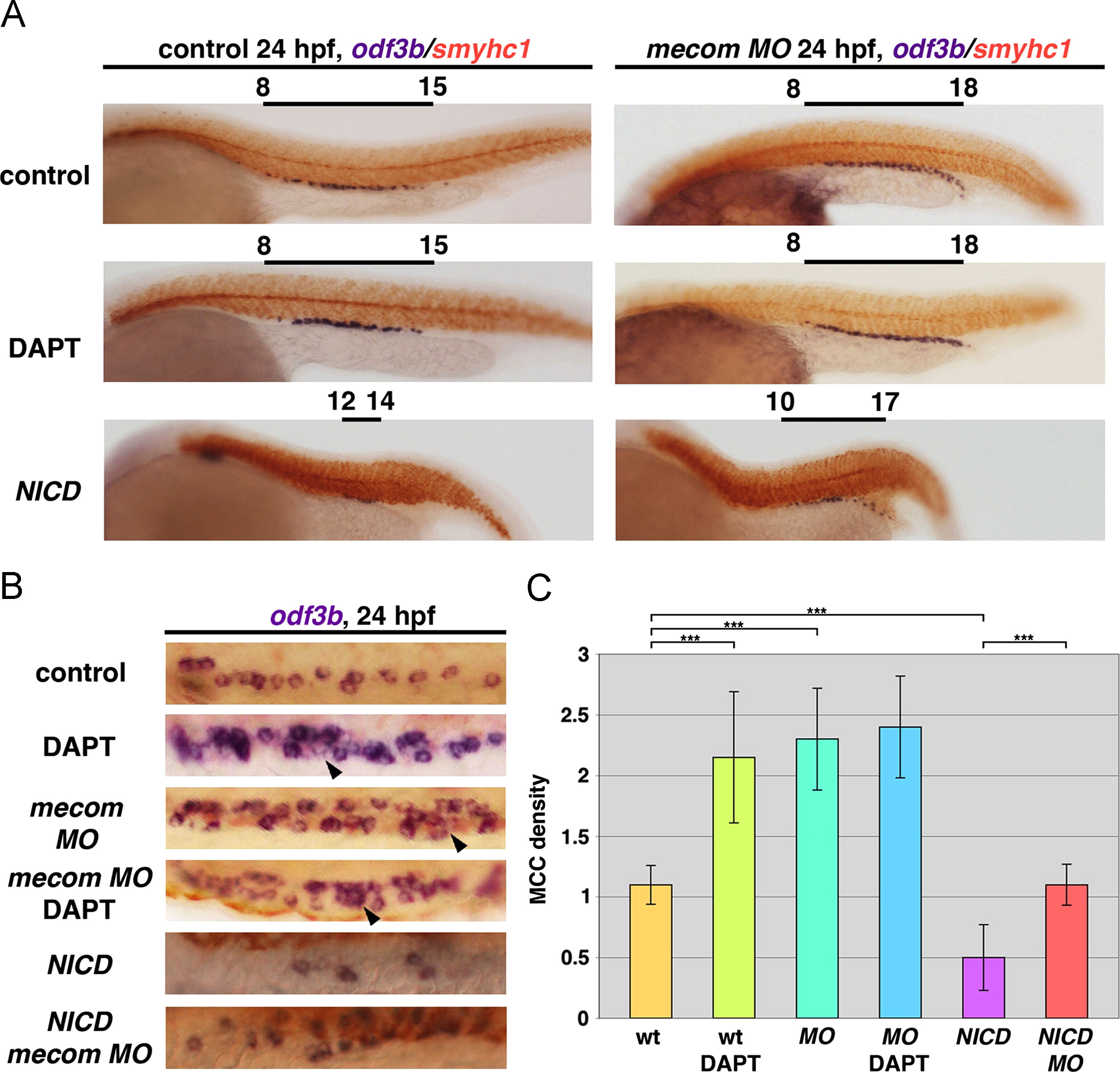 mecom acts upstream of Notch signaling to modulate MCC differentiation and regulate the MCC domain. (A) Wild type embryos treated with 100 µM DAPT showed a significant increase of MCC number without ectopic MCC formation. mecom knockdown led to a caudal expansion of MCC in the DL and PD, and exhibited increased MCC density compared to wild types. A similar condensed MCC arrangement could also be seen in mecom morphants treated with DAPT. The overexpression of Notch1a resulted in decreased MCCs in heatshock induced Tg(hsp70:gal4; uas:notch1a-intra) embryos. Ectopic MCC formation associated with mecom knockdown was abolished by Notch signaling activation, though the domain of MCCs was still expanded. (B) Differentiated MCCs at 24 hpf under 10× magnification in a single nephron from wild types, wild types treated with DAPT, mecom morphants and morphants treated with DAPT, and finally wild types and mecom morphants with NICD overexpression. Note: MCCs displayed a condensed organization/cluster pattern in DAPT-treated wild type and mecom morphant pronephros, while DAPT treatment in mecom morphants failed to induce further MCC density. Arrows indicate large MCC aggregates observed in DAPT-treated wild types, mecom morphants, and DAPT-treated mecom morphants, which were absent from the wild type pronephros. For each experiment, at least 20 embryos were examined. (C) Quantification of MCC density in wild types, wild type embryos treated with DAPT, mecom morphants, and mecom morphants treated with DAPT. The Student t-test revealed significant increase of MCC density in DAPT treated wild types and mecom morphants relative to untreated wild types (***p=0.0005). Alterations of MCC density between mecom morphants and morphants treated with DAPT did not reach statistical significance. For each experiment, at least 20 embryos were examined.
