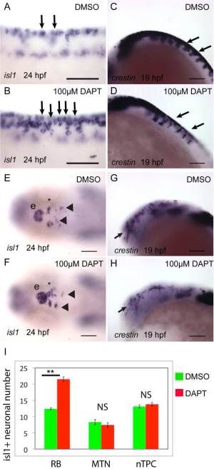 Neural crest and RB neuron development is Notch-dependent, but MTN and nTPC neurons do not require Notch signalling for their development. Embryos treated with 100 µM DAPT or DMSO from 30% epiboly were fixed at 24 hpf (A,B,E,F) or 19 hpf (C,D,G,H) and processed by in situ hybridisation with probes for isl1 (A,B,E,F) or crestin (C,D,G,H). In animals treated with DAPT, lateral aspects of the spinal cord reveal that there are many more RB neurons (arrows) relative to DMSO treated controls (A,B). Commensurate with this, there are less migrating neural crest cells (arrows) at spinal cord levels in DAPT-treated animals relative to controls (C,D). Dorsal views of the brain reveal that there are no obvious changes to nTPC (asterisk) or MTN (arrowheads) neurons in DAPT-treated embryos (E,F). However, lateral views of the head reveal that there are less migrating mesencephalic neural crest cells (arrows) in DAPT-treated animals relative to DMSO treated controls (G,H). Quantification of neurons revealed that DAPT treatment caused a significant reduction of RB neurons (**P<0.01), but no significant change (NS) to MTN or nTPC numbers. Scale bars = 100 µm (A–H).
