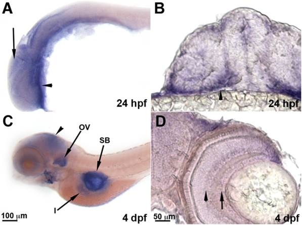 Whole-mount images of in situ hybridization for optn in zebrafish embryos at 24 hpf (A, B) and 4 dpf (C, D). A and C are lateral mounts with anterior to the left and dorsal up. B and D are transverse sections of the head and eyes with dorsal up. A, B. optn expression is ubiquitous in the 24 hpf embryos (arrow) with some enrichment in the ventral head (arrowheads). C. optn expression at 4 dpf shows staining in the head (arrowhead) and higher enrichment in the otic vesicle (ov), swim bladder (sb) and intestine (i). D. Within the 4 dpf eye, optn expression is enriched in the retinal ganglion cell (arrow) and inner nuclear (arrowhead) layers.