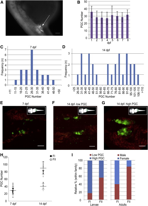 (H) Density dot plot showing changes in the PGC number during development between different mating pairs (FI, closed circles; FII, open circles) at 7 and 14 dpf. Large horizontal bars indicate mean; smaller flanking bars indicate SD.