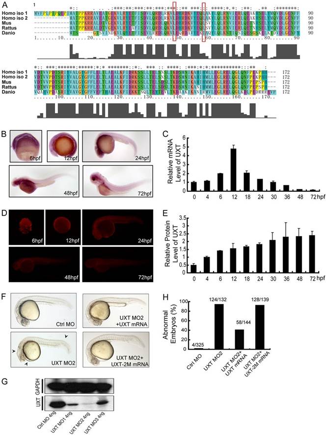 UXT is evolutionarily conserved and developmentally expressed. (A) A sequence alignment of human, mouse, rat and zebrafish UXT proteins by Clustal X. The histogram below the ruler indicates the degree of similarity. Peaks indicate positions of high similarity and valleys indicate low similarity. The asterisk indicates positions that have been fully conserved. The red rectangles indicate the conserved amino acid sites for UXT-2M mutation. (B) Whole-mount in situ hybridization of UXT in zebrafish embryos from 6hpf to 72hpf. The developmental time points are indicated in the panels. (C) Quantification of the UXT mRNA expression in zebrafish embryos from 6hpf to 72hpf by using RT-qPCR. Data show the mean±s.e.m. (at least three independent experiments). (D) Antibody staining of UXT in zebrafish embryos from 6hpf to 72hpf. (E) Quantification of UXT protein expression in zebrafish embryos with the UXT-specific antibody 4B4, from 0hpf to 72hpf, normalized to GAPDH. Densitometry was performed using ImageJ. Data show the mean±s.e.m. (at least three independent experiments). (F) Phenotypic analyses of zebrafish embryos at 24hpf. Embryos were injected with 4ng of control morpholino (Ctrl MO), 4ng of UXT MO2 or 4ng of UXT MO2 with 150pg of UXT mRNA (UXT MO2+UXT mRNA). Additional embryos were injected with 4ng of UXT MO2 plus 150pg of UXT mRNA mutant (UXT MO2+UXT-2M mRNA). All embryos were analyzed at 24hpf. The morphological defects are indicated by black arrowheads. (G) The knockdown efficiency of the morpholinos. Embryos were injected with 4ng of control morpholino, 4ng of UXT MO1, 4ng of UXT MO2 or 4ng of UXT MO3. The embryos were harvested at 24hpf and the lysates were probed with the anti-zebrafish UXT-specific antibody 4B4. (H) Graphical representation of zebrafish phenotypic analyses; the number of embryos analyzed in each group is indicated above the bars.