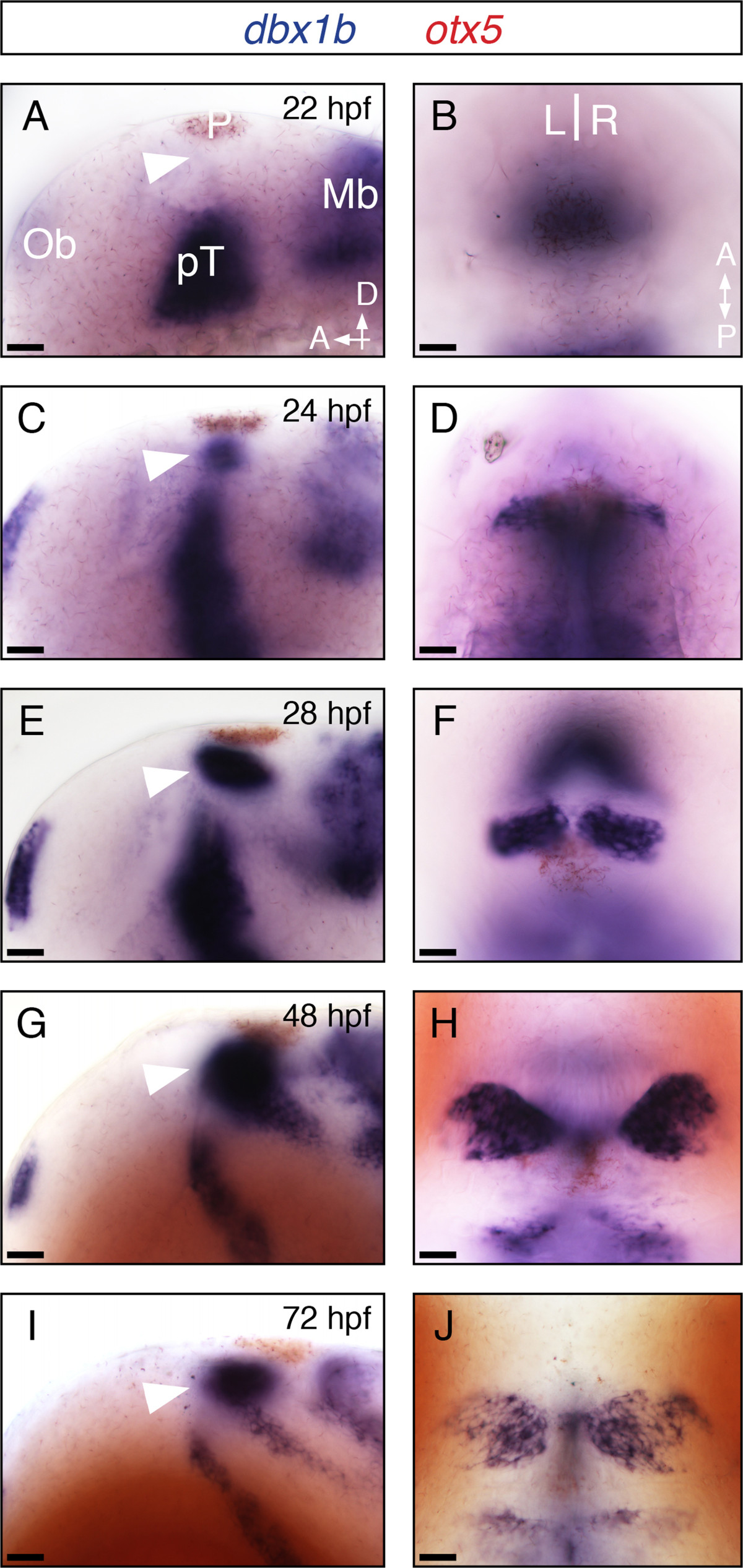 Fig. 1 Dbx1b is expressed throughout habenular development. (A-J) Lateral and dorsal views of dbx1b expression (blue) during early brain development. Dorsal diencephalic expression of dbx1b appeared shortly after 22 hpf and continued through 72 hpf (arrowhead). otx5 (red) marks the pineal complex (P). Ob, olfactory bulb; pT, prethalamus; Mb, midbrain. Scale bars are 10 μm.