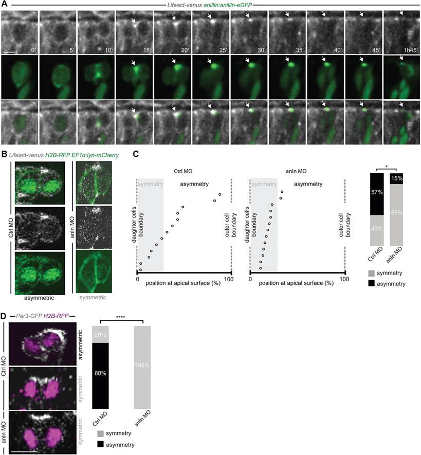 Fig. 2 Anillin is required for the apical distribution of F-actin and Par3. (A) Frames from supplementary material Movie 3. F-actin accumulates at the Anillin-eGFP-labelled midbody (arrow) at the end of cytokinesis. (B) Asymmetric (CtrlMO; frames from supplementary material Movie 4) and symmetric (anlnMO; frame from supplementary material Movie 5) distribution of apical F-actin accumulation. (C) Position of the apical F-actin-rich domain (CtrlMO, n=14; anlnMO, n=13) (as described in Fig. 1E-F and supplementary material Fig. S3); the frequency of asymmetry is 57% in CtrlMO and 15% in anlnMO (Wilcoxon Mann–Whitney test, *P<0.05). (D) Symmetric versus asymmetric inheritance of Par3 in CtrlMO (frame from supplementary material Movie 6) and anlnMO (frame from supplementary material Movie 7) injected embryos (two-tailed Fisher′s exact test, ****P=104, CtrlMO, n=15; anlnMO, n=15). All images represent a single z-plane of a confocal stack. The apical surface of the retinal neuroepithelium is to the top. Scale bars: 4.8µm in A; 5µm in D.