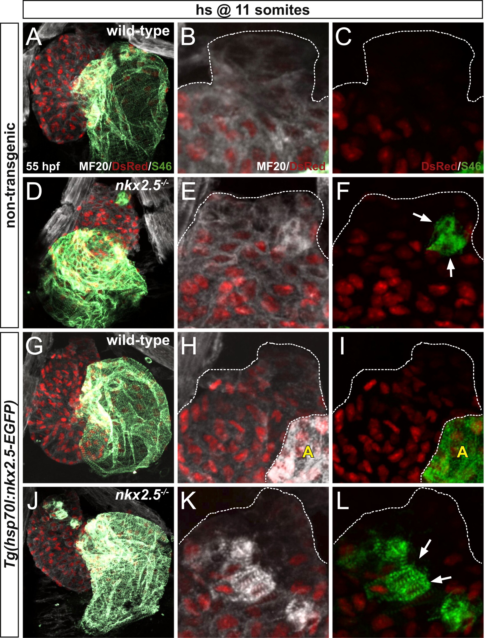 nkx2.5 is necessary to maintain ventricular identity in late-differentiating cardiomyocytes derived from the SHF. MF20/S46 immunofluorescence distinguishes ventricular myocardium (white) from atrial myocardium (green) in non-transgenic (A-F) and Tg(hsp70l:nkx2.5-EGFP) (G-L) embryos. Confocal projections of wild-type (A-C, G-I) and nkx2.5-/- (D–F, J–L) hearts depict cardiomyocyte nuclei with Tg(-5.1myl7:nDsRed2) (red). Ventral views, arterial pole to the top, at 55 hpf. (B,C,E,F,H,I,K,L) White dots outline the MF20+ cardiomyocyte borders in the OFTs of hearts in (A,D,G,J), respectively. White arrows indicate ectopic S46+ cells; “A” denotes atrium. All embryos were heat-shocked at 11 somites. (A–C) In wild-type non-transgenic hearts, the late-differentiating cardiomyocyte population exhibits MF20, but not DsRed, fluorescence due to the delay in expression of Tg(-5.1myl7:nDsRed2) at the arterial pole. (D–F) Similarly, in non-transgenic nkx2.5-/- hearts, cardiomyocytes expressing MF20, but not DsRed, are present at the arterial pole. A few ectopic S46+ cardiomyocytes are also visualized in this region (DsRed nuclei). (G–I) In transgenic wild-type hearts, MF20, but not DsRed, fluorescence at the arterial pole designates the delayed differentiation of these SHF-derived cardiomyocytes. (J–L) Despite the rescue of the cardiac chamber morphology and identity, excess S46+ cardiomyocytes are visualized at the arterial pole of transgenic nkx2.5-/- hearts where the late-differentiating population accretes (DsRed nuclei).