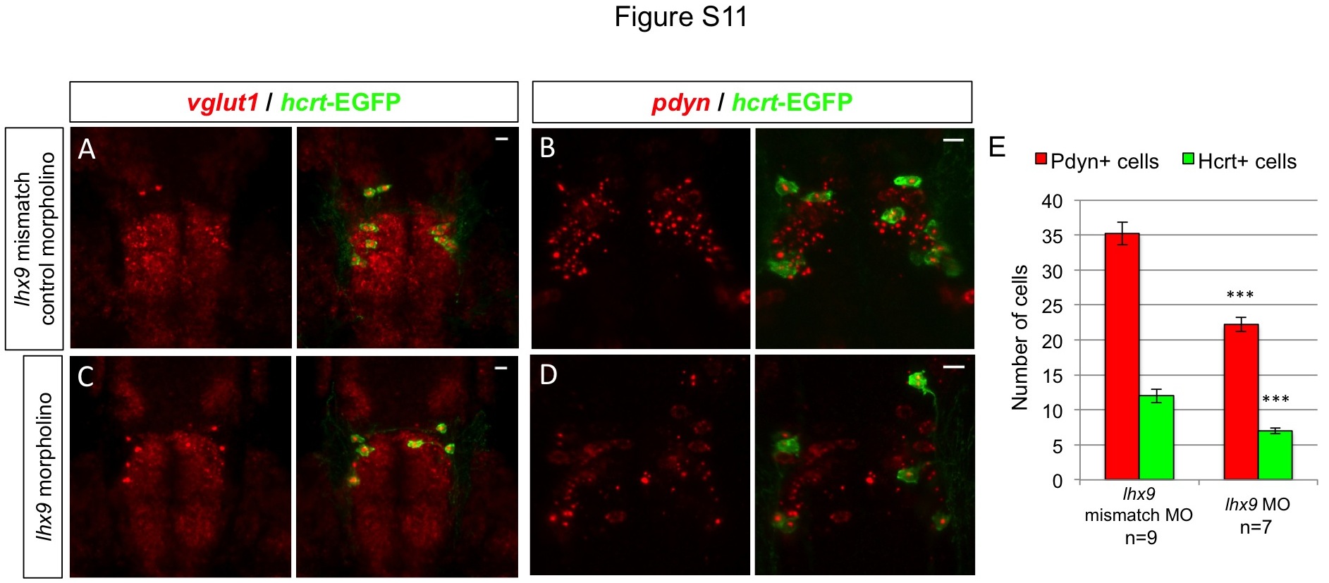 Fig. S11 Endogenous hcrt- and pdyn-expressing neurons are reduced in lhx9 morphants. Tg(hcrt:EGFP) embryos injected with either lhx9 morpholino (C, D) or lhx9 mismatch control morpholino (A, B) were fixed at 72 hpf and probed for vglut1 or pdyn expression by fluorescent ISH. No obvious defects in vglut1 expression were observed in lhx9 morphants, but the total number of cells with intense, punctate pdyn expression was reduced by approximately 40% (E). This result suggests that the morpholino-induced reduction in Hcrt neurons is caused by cell loss, rather than silencing of hcrt expression. n indicates number of morphant brains analyzed. ***, p<0.001 compared to embryos injected with the control morpholino by Student’s t-test. Scale = 10 µm.