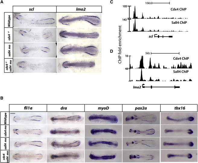 (D and E) Gene track of the scl (D) and lmo2 (E) loci, showing Cdx4 and Sall4 binding.