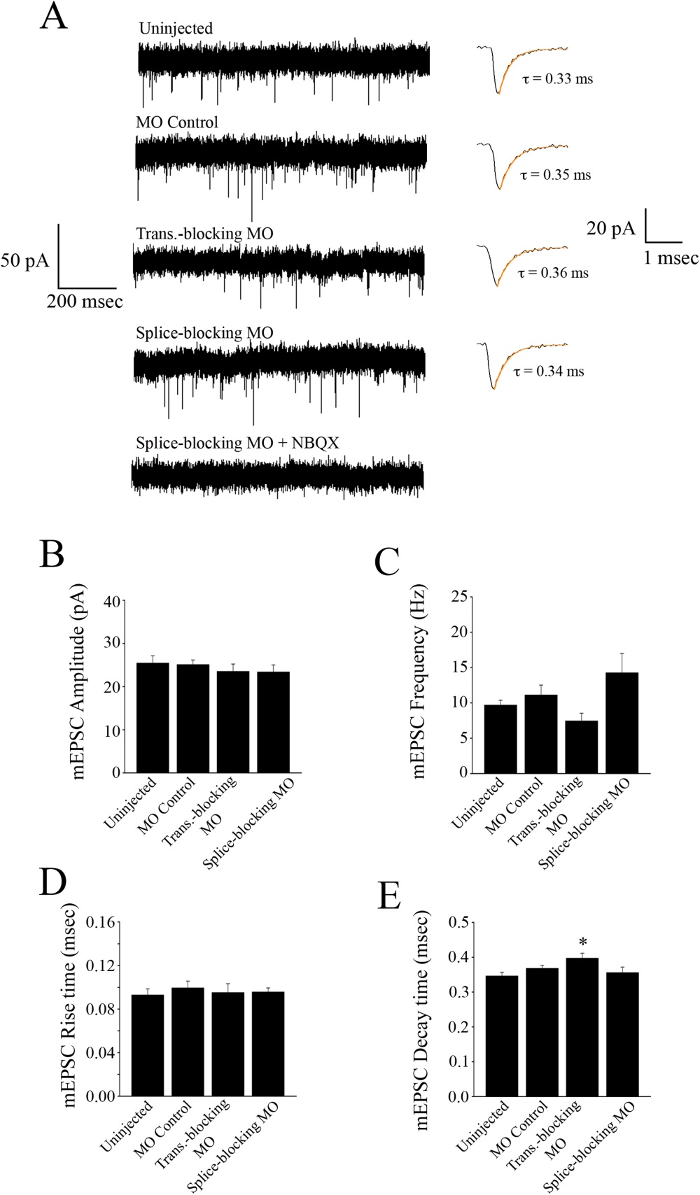 Fig. 4 Spontaneous synaptic AMPAR currents obtained from M-cells. (A) Uninjected embryos (n = 7), control morpholino injected embryos (n = 8), translation-blocking morpholino injected embryos (n = 7), and splice-blocking morpholino injected embryos (n = 6) exhibit AMPAR currents at similar frequencies. The inclusion of NBQX (0.1 µM) confirmed the mEPSCs as AMPAR-mediated. Preparations were incubated in TTX (1 µm), strychnine (5 µM), picrotoxin (100 µM), and APV (50 µM) to block action potentials, glycine, GABA and NMDA receptors, respectively. Average traces are shown to the right of each recording; each trace is an average of multiple events; 215 mEPSCs for the uninjected controls, 224 events for the MO controls, 174 events for the translation-blocking morphants, and 276 events for the splice-blocking morphants. Bar graphs comparing the peak amplitude (B), frequency (C), 20–80% rise time (D), and decay time course (E) of averaged AMPA mEPSCs. * Significantly different from uninjected controls, p < 0.05.