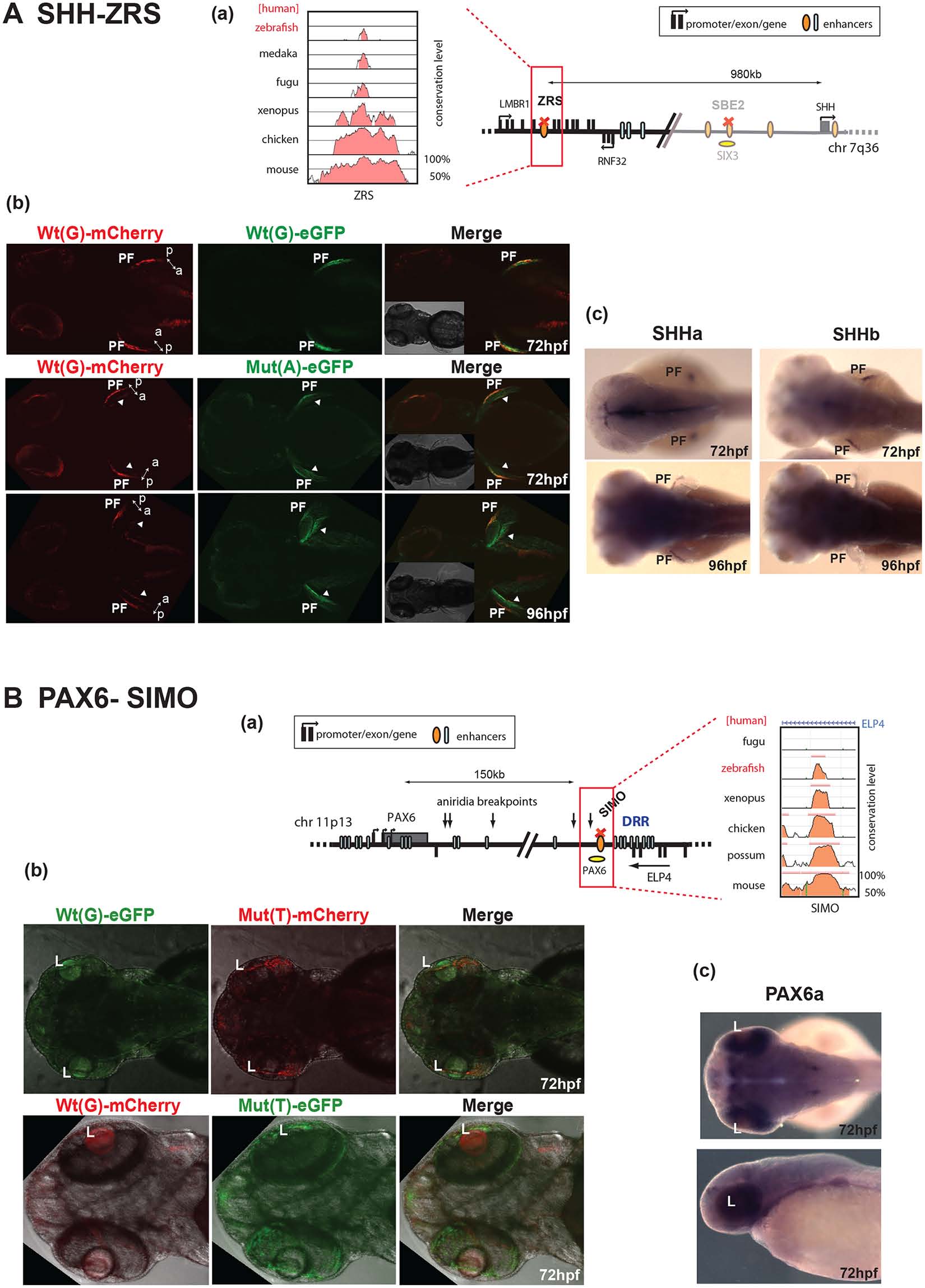 (A) SHH-ZRS. (a) The regulatory landscape of SHH, depicting the location of ZRS enhancer. The conservation plot on the left shows the low level of sequence conservation for ZRS in the zebrafish genome. (b) SHH-ZRS enhancer-driven reporter expression is shown at 72 hpf and 96 hpf. The top row shows the Wt(G) allele driving both mCherry and eGFP expression to equal measure in a restricted region of the developing pectoral fin (PF), coinciding with the expression domain of both shha and shhb in the developing pectoral fin (c). The Mut(A) allele drives expression at an additional site on the opposite edge of the fin. The ectopic expression (arrowheads) is increased by 96 hpf. The double-headed arrow indicates the anterior (a)—posterior (p) axial plane of the developing pectoral fin. (B) PAX6-SIMO. (a) The regulatory landscape of PAX6, depicting the location of SIMO enhancer. The conservation plot on the right shows the presence of sequence conservation for SIMO in the zebrafish genome. (b) PAX6-SIMO enhancer-driven reporter expression is shown at 72 hpf. In contrast to the Wt(G) element, and irrespective of the fluorophore used, the Mut(T) allele consistently fails to drive reporter gene expression in the developing lens (L). (c) RNA in situ hybridisation analysis of zebrafish pax6a at 72hpf showing the endogenous pax6a expression pattern in the developing eye with strong retinal expression and weaker lens expression overlapping with the reporter domain driven by the Wt(G). Wt: wild-type; Mut: mutant; hpf: hours post fertilization.